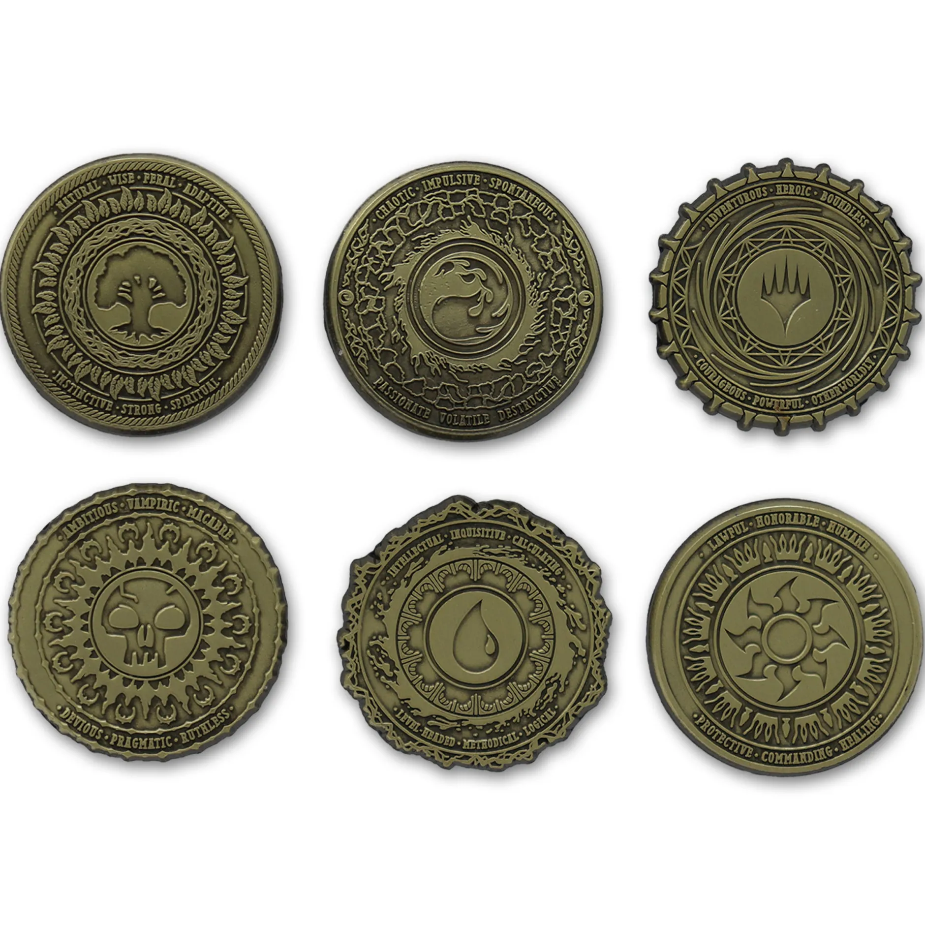 - 6 edle Metallanstecker mit den Mana-Symbolen und dem Zeichen des Planeswalkers aus dem Spiel „Magic: The Gathering“