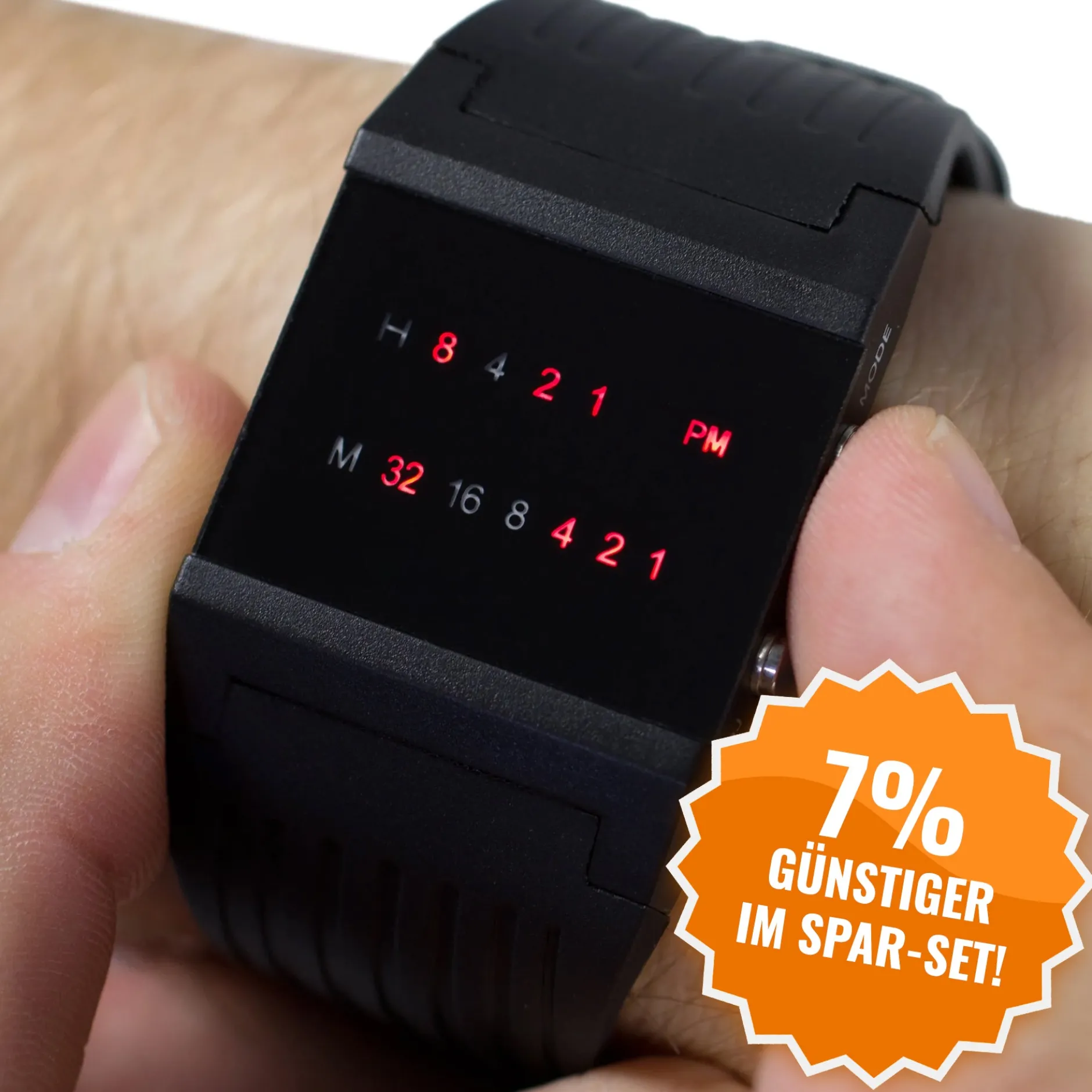 Diese einzigartige Uhr zeigt die Zeit in binärer Darstellung und ist ein echter Hingucker – wenn man weiß worauf man gucken muss. Perfekt für alle, die auch unterwegs ihren Informatik-Horizont zeigen möchten.
