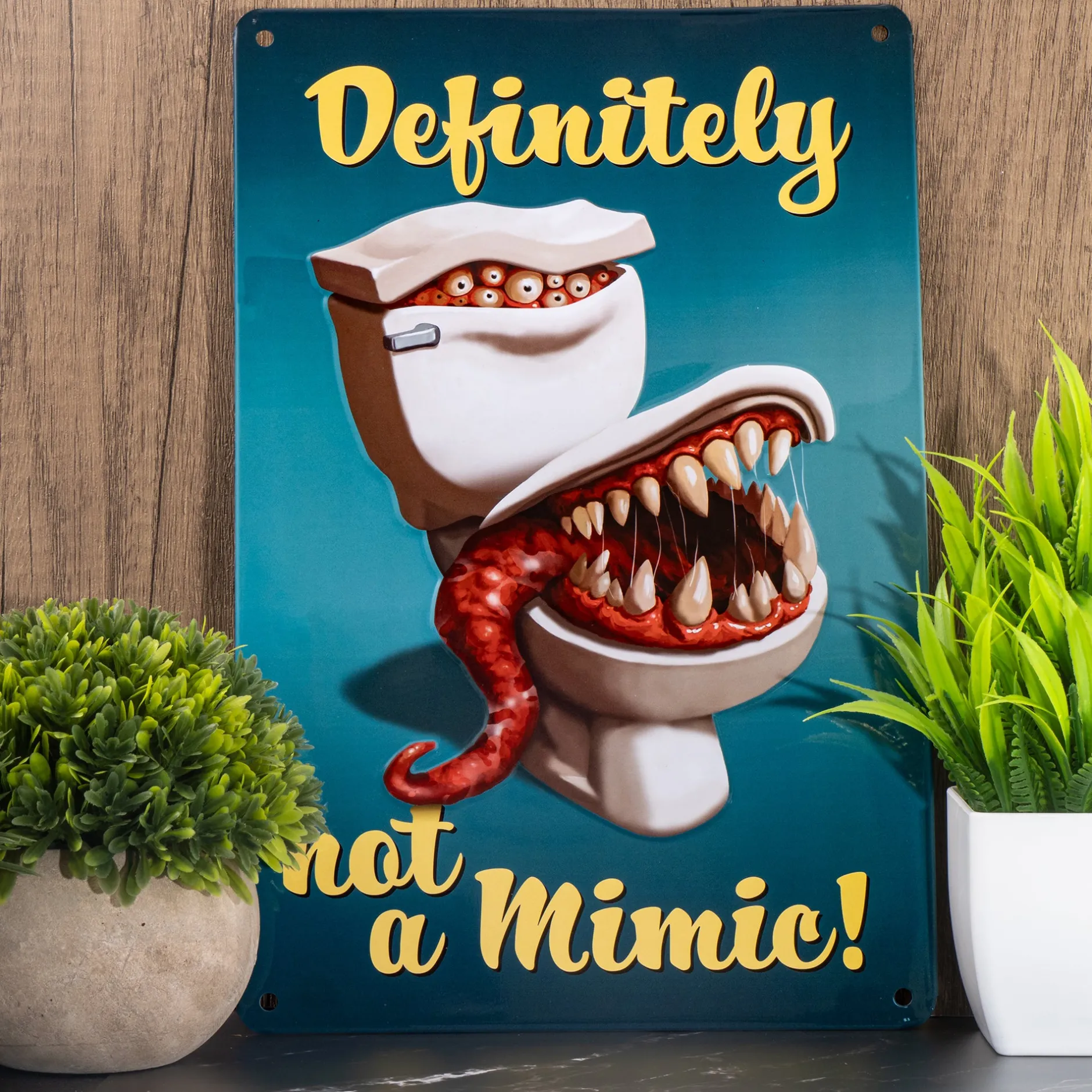 Du sitzt nichtsahnend auf der Toilette – und plötzlich fordert dein DM einen Geschicklichkeits-Rettungswurf von dir? Klassisches Dungeon-Problem, oder? Wer Fantasy Pen & Paper Rollenspiele liebt, kennt sie: Mimics! Die fiesen Biester tarnen sich als harmlose Alltagsobjekte und schnappen gnadenlos zu. Mit dem Blechschild – Definitely not a Mimic bringst du genau diesen absurden Charme direkt in dein Bade- oder Gaming-Zimmer.