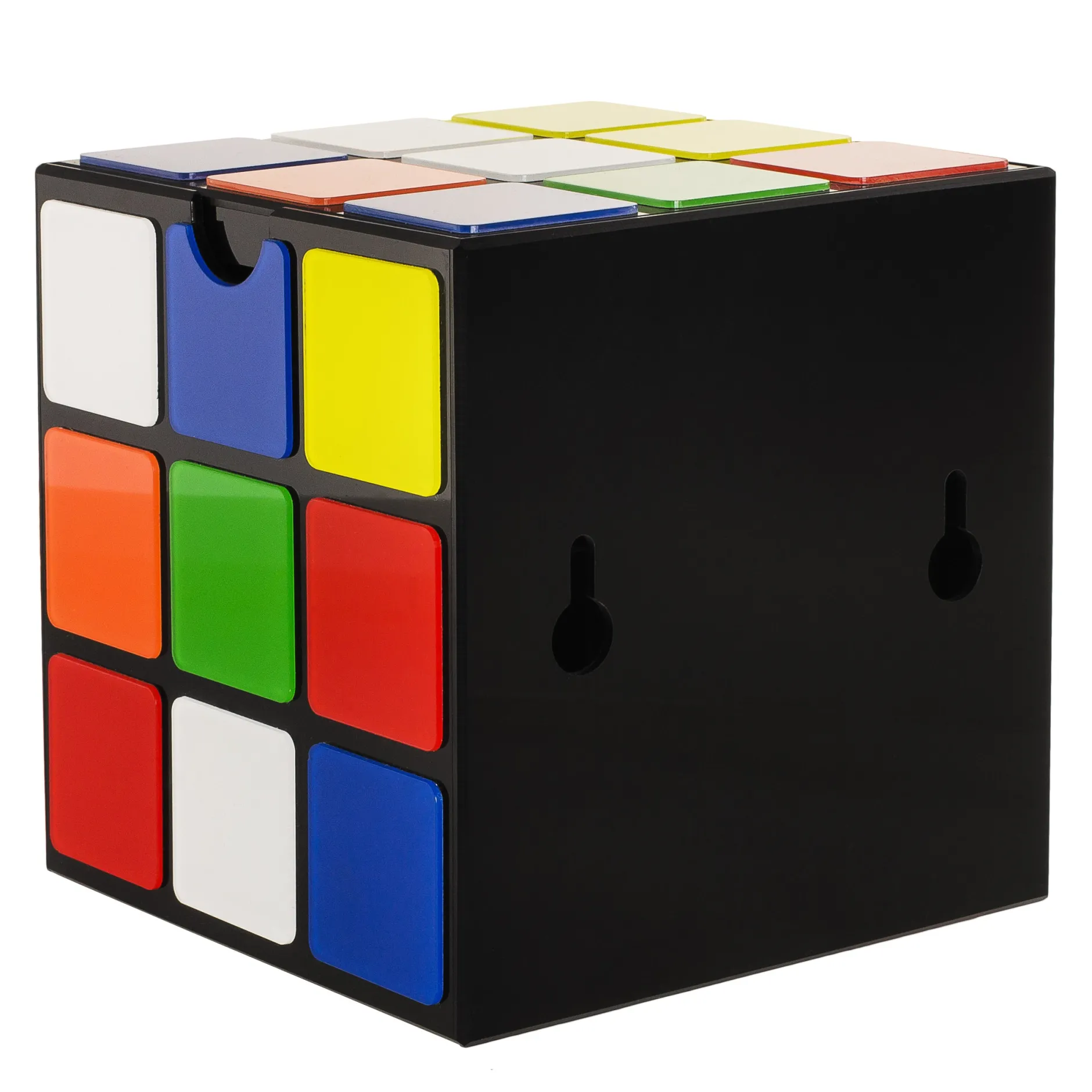 Auch wenn der Würfel natürlich zum Knobeln einlädt, solltest Du ich sicherheitshalber aber entweder mit starkem Montageklebeband an den Kacheln festkleben oder mit Schrauben (nicht enthalten) an der Wand befestigen. Übrigens lässt sich auf dem Deckel auch perfekt das eigene Smartphone ablegen. 🙂