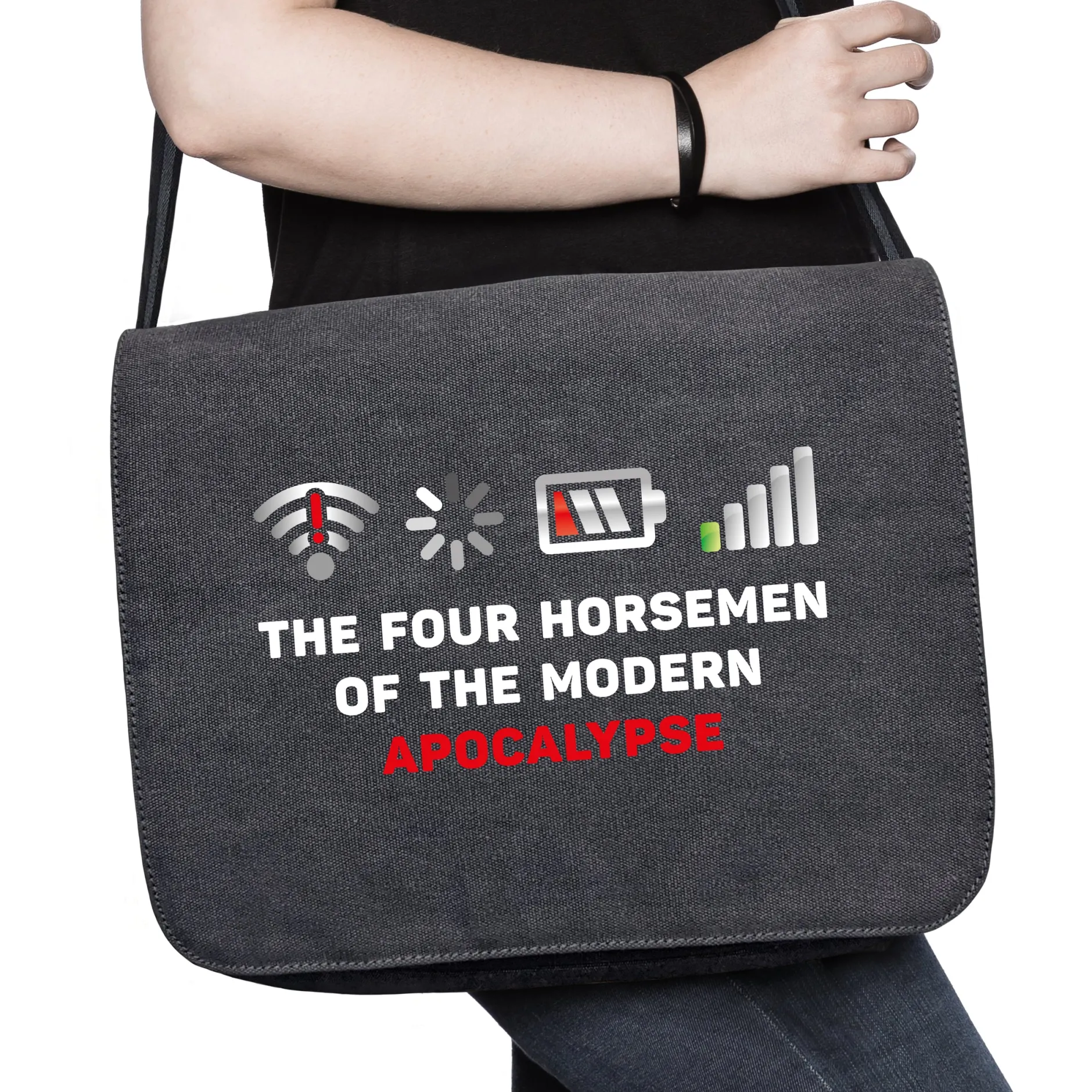 Wir schlagen vor, die biblische Reiterei durch die Aspekte zu ersetzen, die auf dem „Four Horsemen“-Shirt zu sehen sind: Kein WLAN-Empfang, ein nicht ladendes Video, ein leerer Akku und schlechter Mobilfunkempfang. Kurz gesagt: das Schlimmste was einer technikbegeisterten Person heutzutage passieren kann. 😉