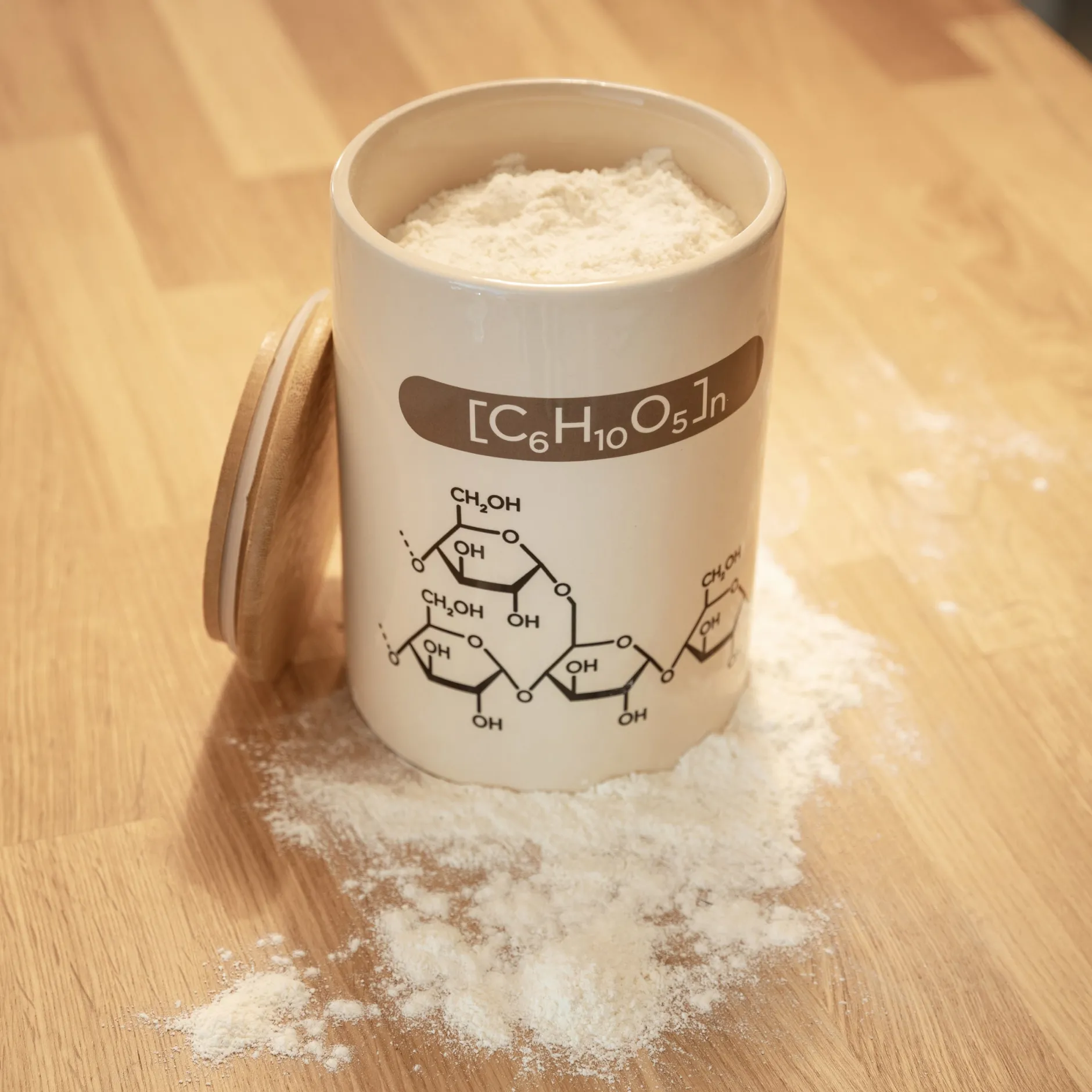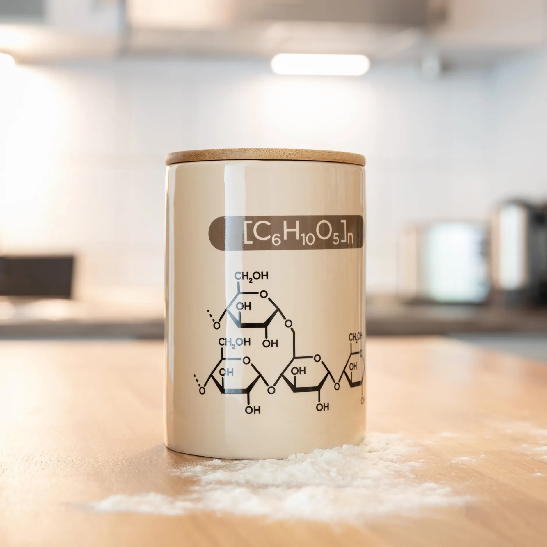 Für alle Chemiker*innen und sonstigen Wissenschaftler*innen gibt es jetzt den perfekt geeigneten Vorratsbehälter Mehl mit chemischen Formeln, mit dem ihr euch das Labor-Feeling jederzeit nach Hause in die eigene Küche holen könnt. Die Keramikdose ist mit der korrekten chemischen Formel für ihren Inhalt beschriftet und zeigt die passende Strukturformel. Der Deckel ist aus Bambus und hat eine praktische Silikondichtung.