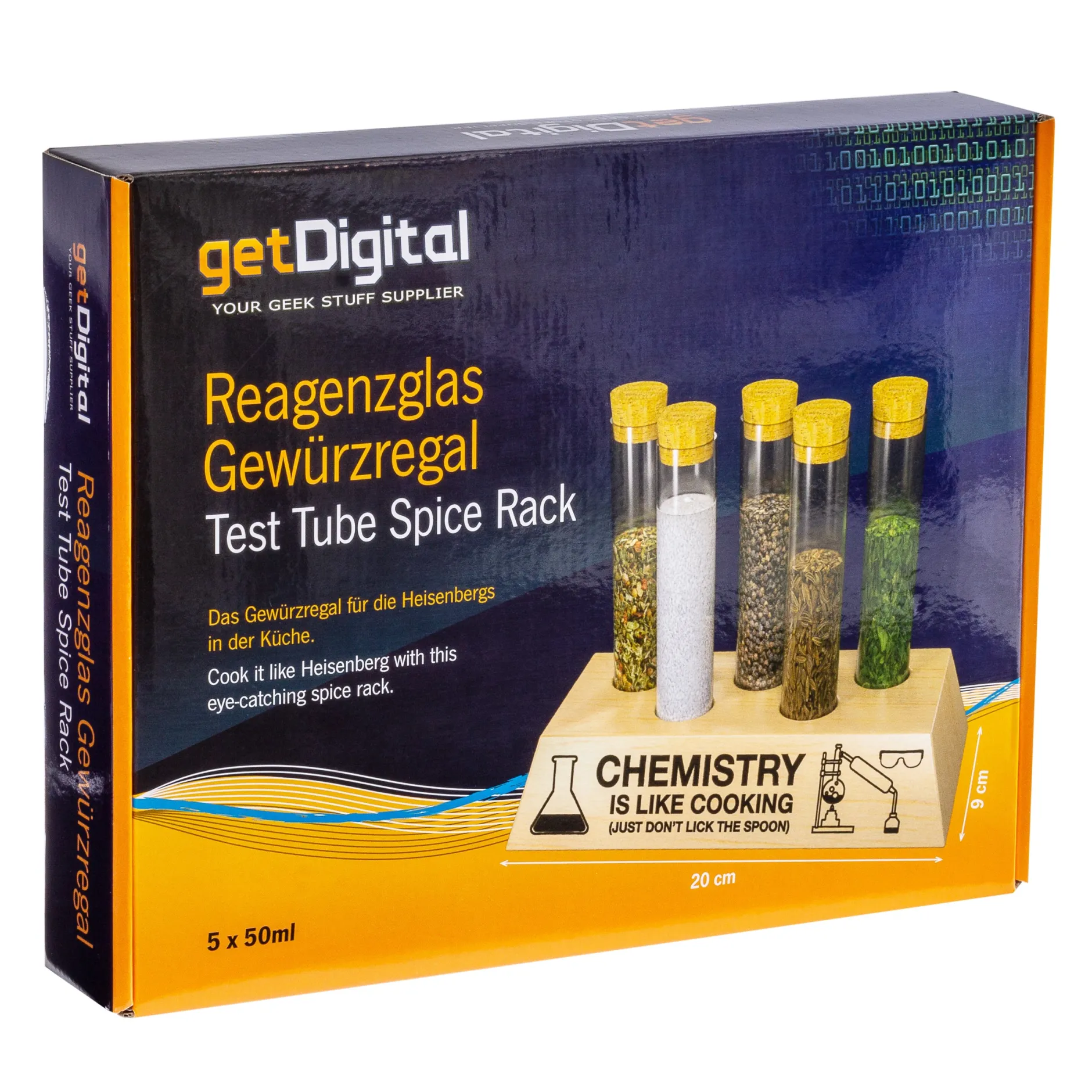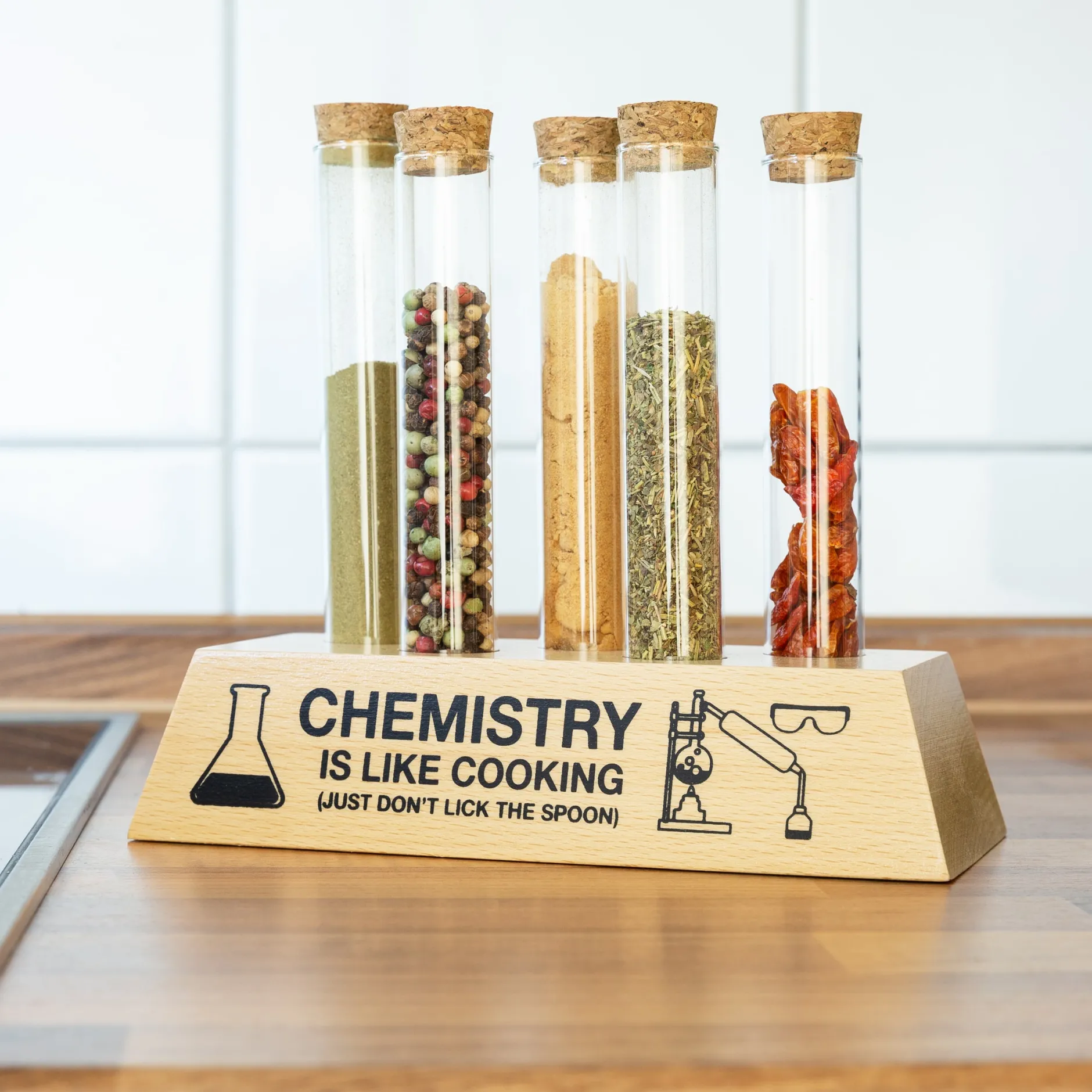 Und das Reagenzglas-Gewürzregal wird Dir dabei helfen, auch in diesem Feld zur absoluten Elite zu gehören! Auf dem Sockel aus massivem Buchenholz finden fünf Glasröhrchen Platz, die sich mit Gewürzen füllen und mit einem Korken verschließen lassen. Dank der Lackierung verkraftet das Holz auch den gelegentlichen Spritzer Tomatensauce ohne Probleme! Und falls Du im Eifer des Gefechts doch mal durcheinander kommst und nicht weißt, ob Du gerade im Labor oder in der Küche bist, hilft Dir der Aufdruck weiter: Chemie ist wie Kochen, nur solltest Du bei ersterem den Löffel nicht ablecken. Und überhaupt: Natriumchlorid, Natriumphosphat – wo ist da denn bitte der Unterschied? 😉