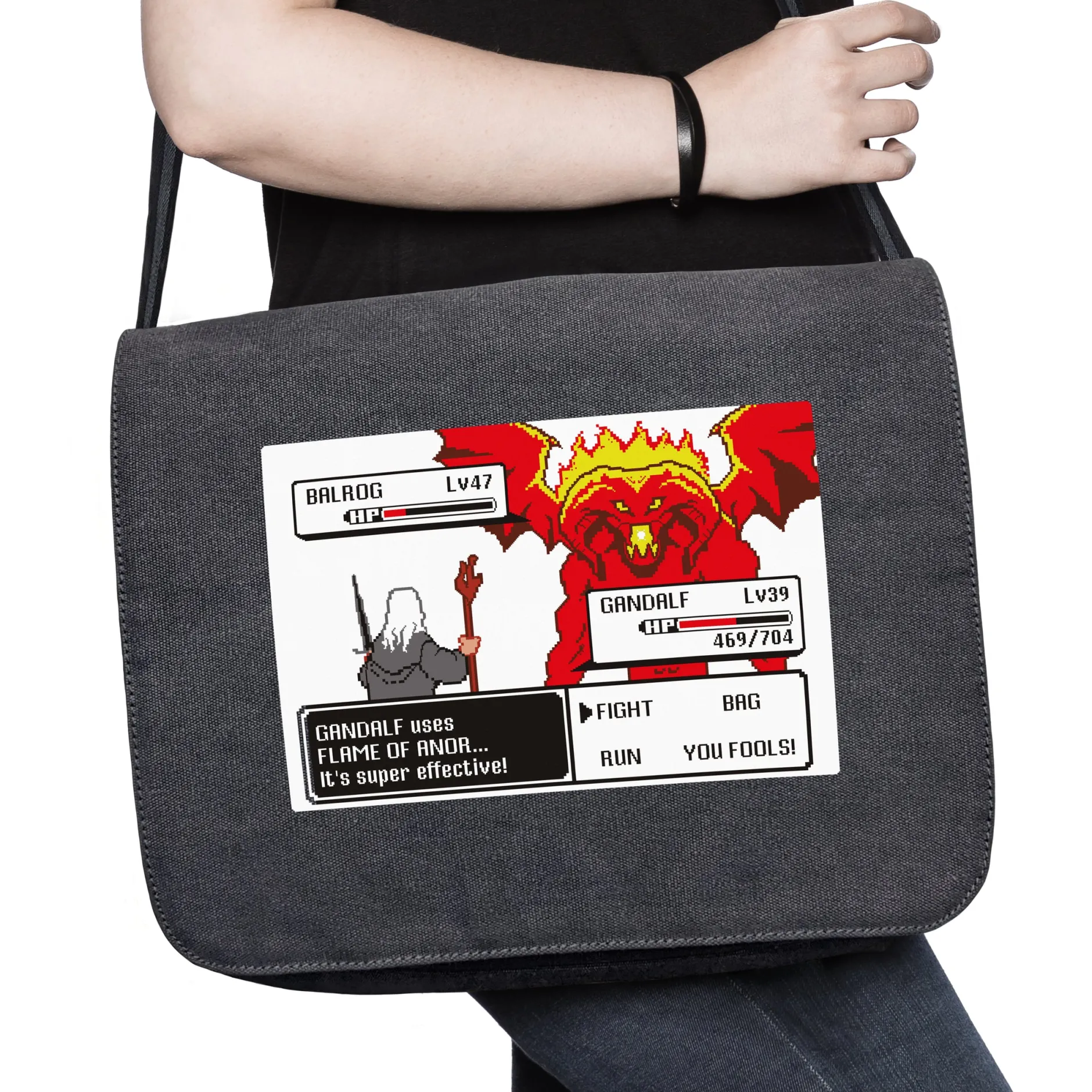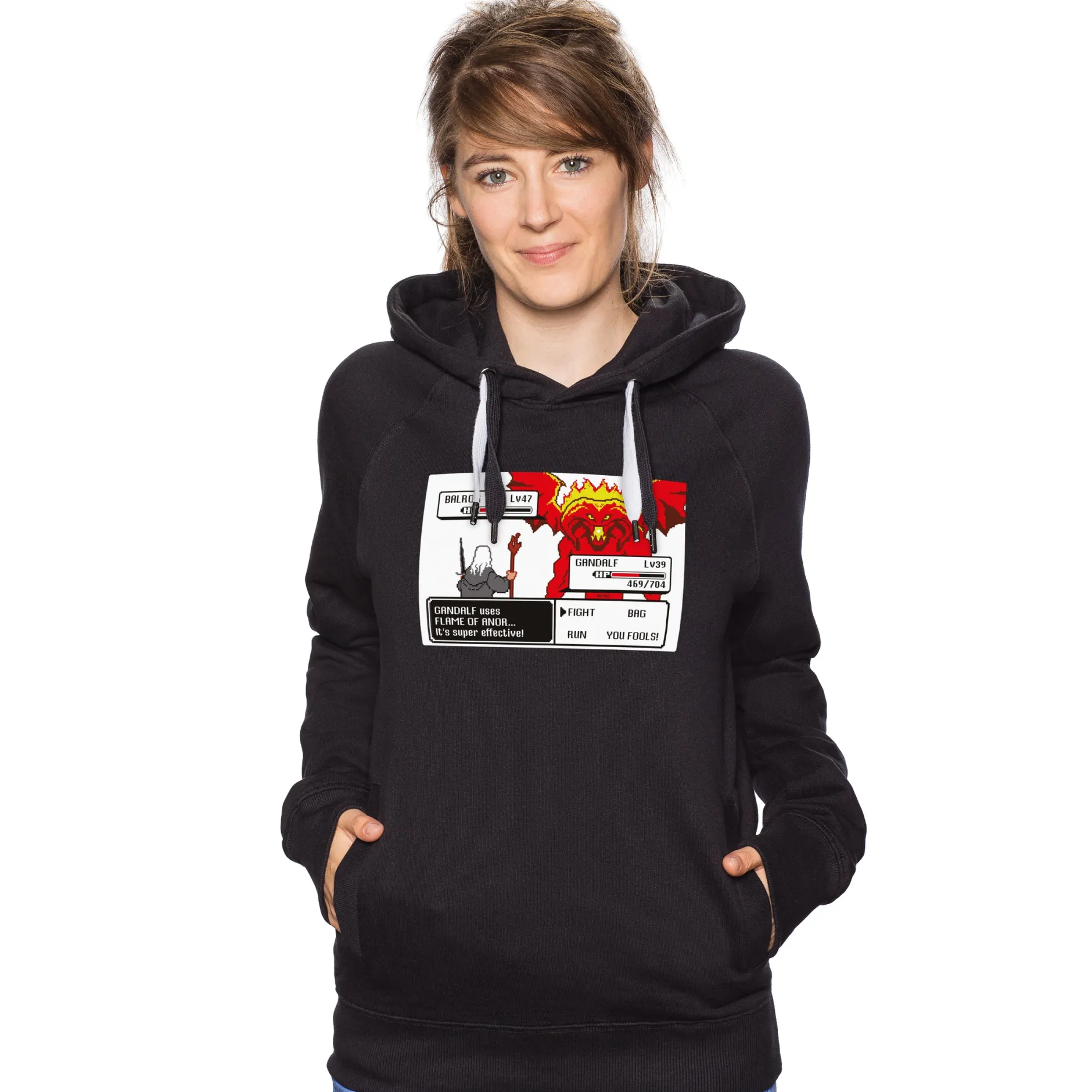 Auf diesem Crossover-Shirt wird ein epischer Kampf aus einem bekannten Fantasy-Franchise zum Retro-Game stilisiert. Der bärtige Zauberer hat hier ganz wie im alten Design der Spiele für Gameboy und Co. die Möglichkeit, verschiedene Strategien auszuwählen. Wer den Film kennt, weiß, wofür sich der Magier entscheidet…