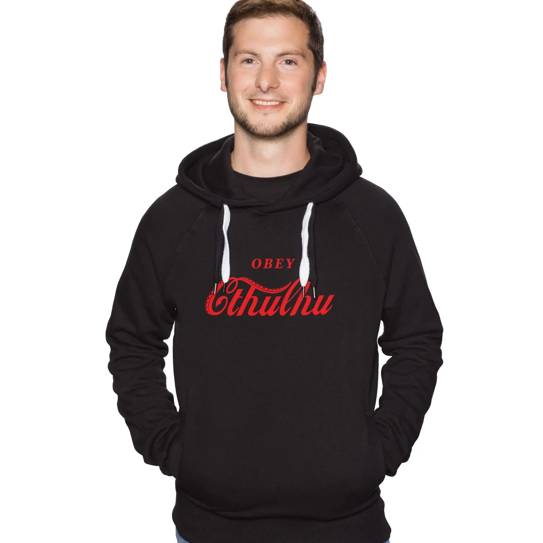 Warum? Schau Dir mal ganz genau das „Obey Cthulhu“-T-Shirt an: Auf den ersten Blick wirst Du nur die Werbung eines bekannten Cola-Herstellers sehen. Bei genauerem Hinsehen wirst Du allerdings bemerken, dass dort nicht etwa „Enjoy **** Cola“ (engl.: [i]Genieße **** Cola[/i]) steht, sondern „Obey Cthulhu“ (engl.: [i]Gehorche Cthulhu[/i])! Wer sich mit Okkultismus auskennt, weiß natürlich, wer Cthulhu ist: Der bekannteste der Großen Alten aus den Werken H. P. Lovecrafts. Und dieser riesige Tintenfisch hat kein anderes Ziel, als die Menschheit zu vernichten! Neuerdings scheint er statt auf Kultisten wohl eher auf stark gezuckerte Softdrinks zu setzen… 😉