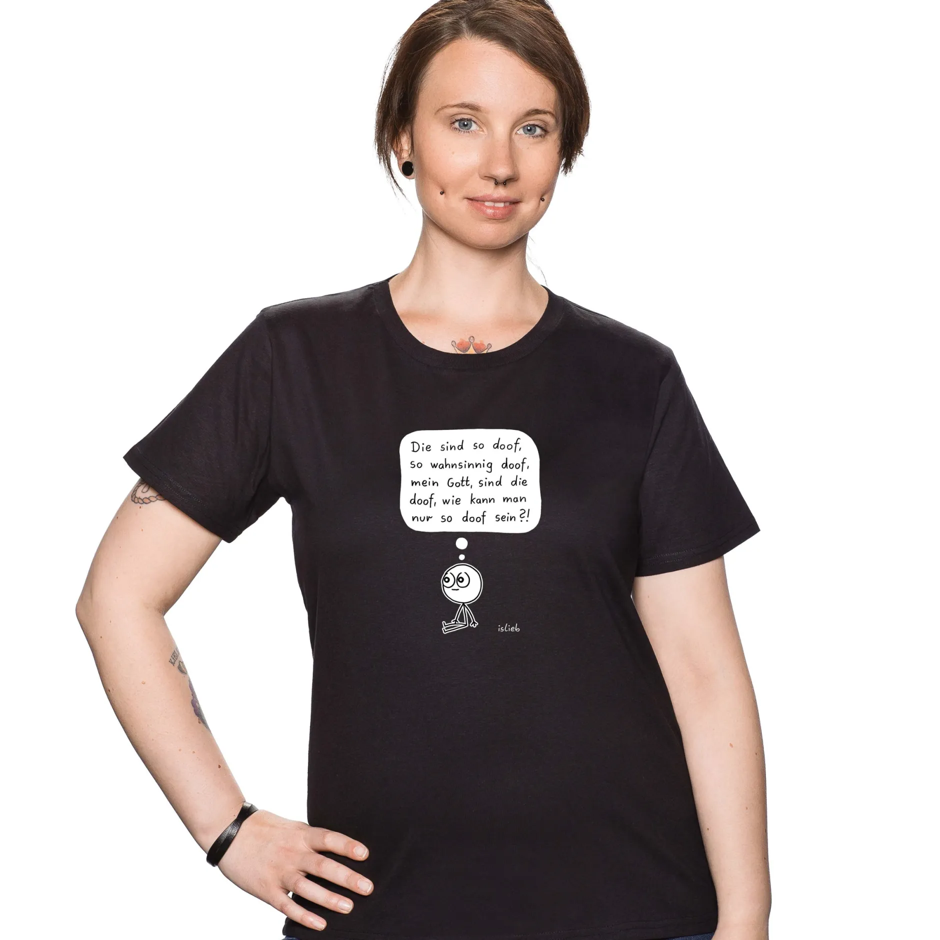 Wenn es etwas in deinem Leben gibt, das wirklich schlimm ist, sich aber nicht ändern lässt, hilft nur Akzeptanz. Vielleicht auch Meditation. Lass alle Gedanken, die auftauchen, einfach vorbeiziehen wie Wolken. Selbst wenn es dunkle Gewitterwolken sind. Oder doofe Menschen. Lass sie einfach vorbeiziehen, stell deine Ohren auf Durchzug und zeige ihnen dein islieb – Fassungslosigkeit T-Shirt. Vielleicht verstehen sie diesen subtilen Wink ja sogar und lassen dich in Ruhe. Bei aller Akzeptanz darfman die Hoffnung auf Besserung niemals aufgeben!
