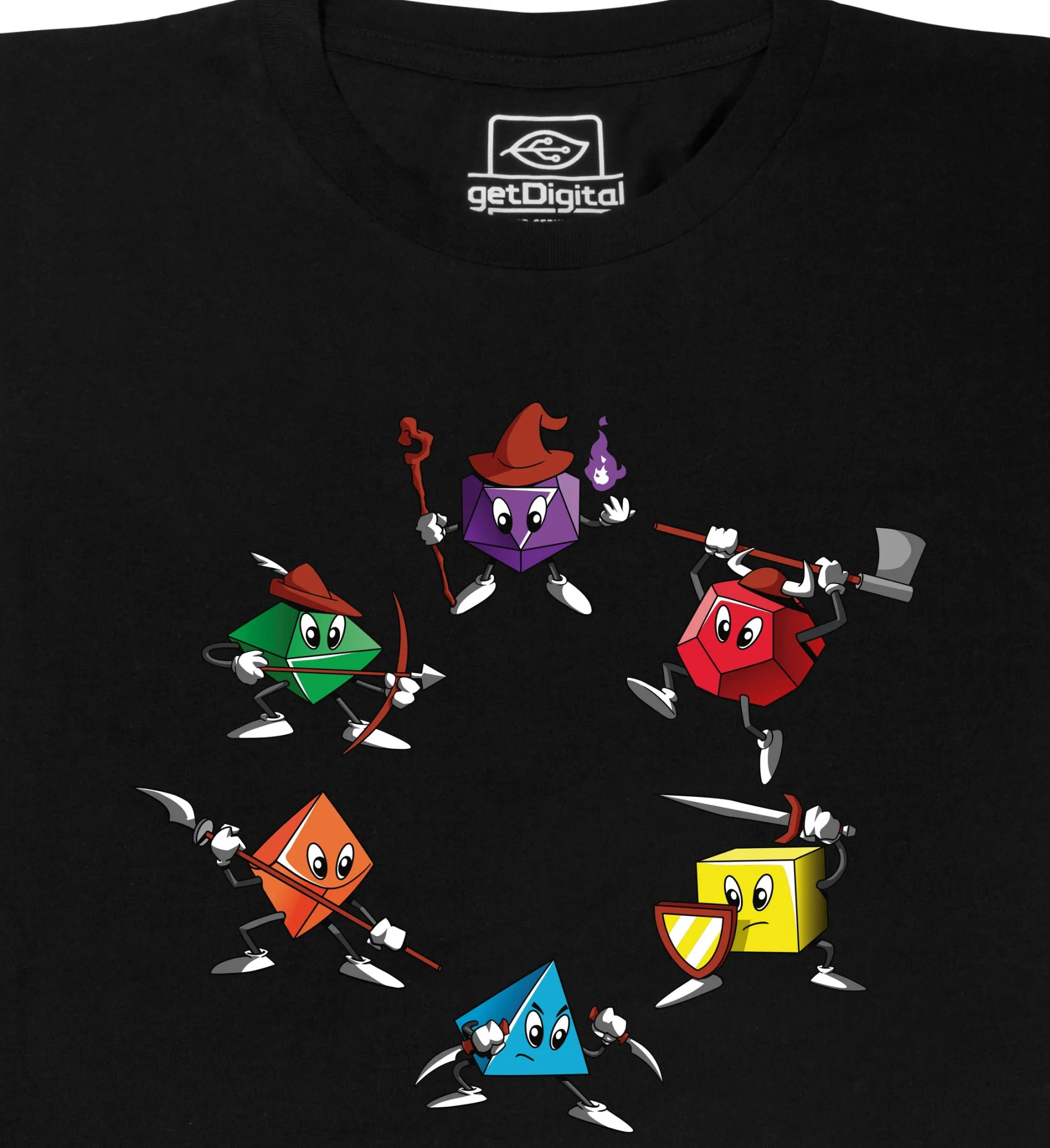 [i]Hinter jedem guten Spieler stehen mehrere gute Würfel. [/i] Während wir Spaß haben, looten und uns nachher für bestandene Abenteuer gebührend feiern, gehen unsere treuen Begleiter meist leer aus. Eher ernten sie noch Kritik, wenn sie statt der erhofften eins eine zwanzig zeigen – oder umgekehrt. Es wird also Zeit die kleinen Helden endlich einmal gebührend zu würdigen, was du mit diesem RPG Dice T-Shirt tun kannst! Trage es beim nächsten Rollenspielabend und du wirst dich wundern, wie viel wohlgesonnener deine Würfel dir sein werden. 😉