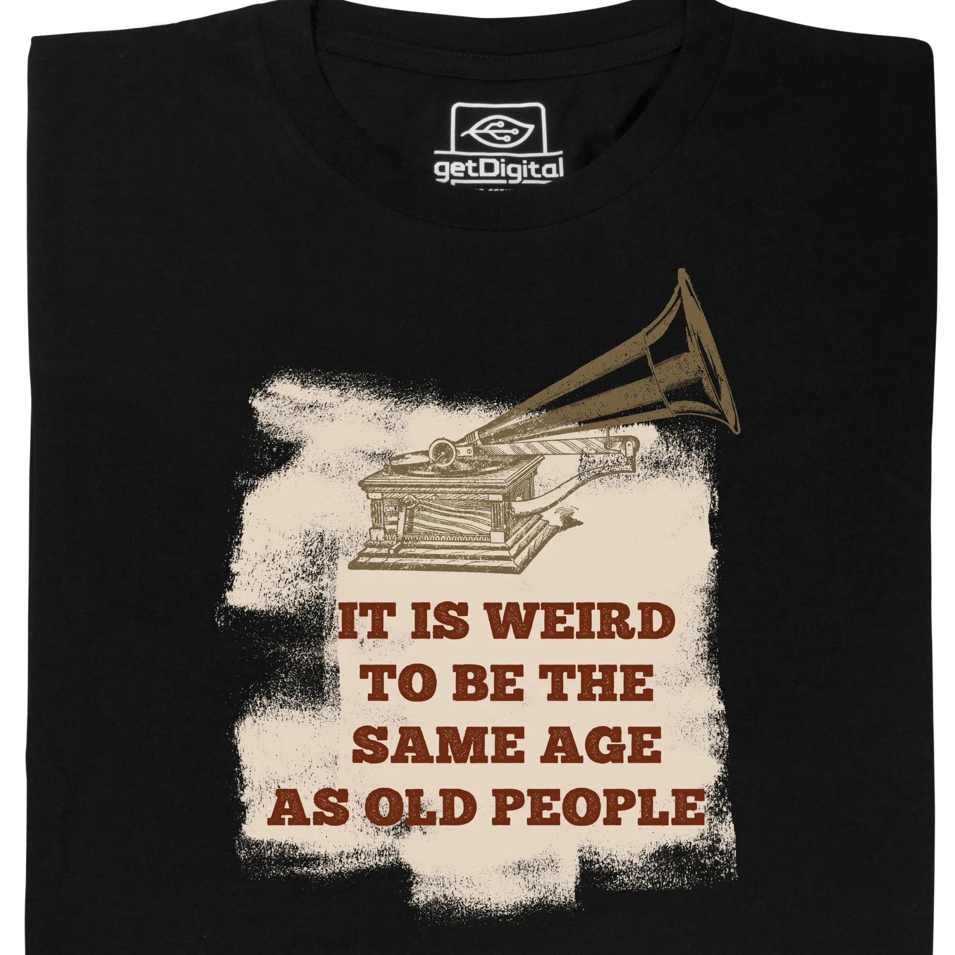 Eben noch hat man sich über die eigenen Eltern oder Großeltern geärgert, und im nächsten Moment stimmt die Zahl auf der Geburtstagstorte überhaupt nicht mehr mit der eigenen Selbstwahrnehmung überein. Das T-Shirt „Wie alte Leute“ greift auf humorvolle Weise die allgemeine Überraschung und das leichte Unbehagen auf, das manche Menschen empfinden, wenn sie feststellen, dass sie das Alter erreicht haben, das sie früher für „alt“ hielten. Auf dem T-Shirt ist das nostalgische Bild eines Grammophons zu sehen, das symbolisch für vergangene Zeiten und ältere Generationen steht. Der Spruch darunter lautet: „It is weird to be the same age as old people“. (Es ist seltsam, das gleiche Alter wie alte Menschen zu haben).