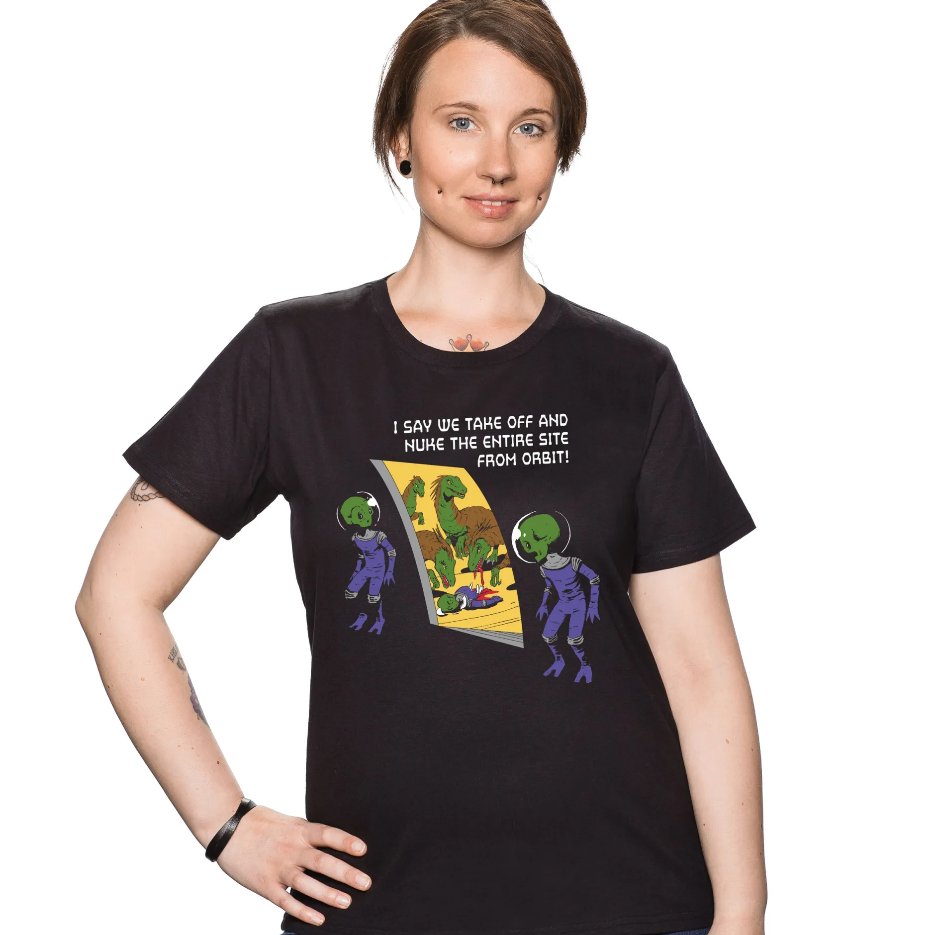 Als bekennender Paläontologie-Nerd wirst du beim Anblick des “Rache an den Dinos” T-Shirts vermutlich verzweifeln. Da hat es mehrere Jahrzehnte gebraucht, um zu beweisen, dass ein Meteoriteneinschlag die Dinos ausgelöscht hat und dann findest du hier so etwas. Aliens, pff. Schließlich haben wir die Iridiumablagerungen und den dazu passenden Chicxulub-Krater in Mexico als Beweis. Aber… würde eine Alien-Bombe nicht die gleichen Spuren hinterlassen? Und, ganz ehrlich, es gibt keinen anderen Grund, dass wir seitdem keinen außerirdischen Kontakt mehr hatten, als dass Raptoren, T-Rex und Co. die armen Wesen in die Flucht geschlagen haben. Solange es also keine Gegenbeweise gibt, kann man das schon so stehen lassen, oder? 😉