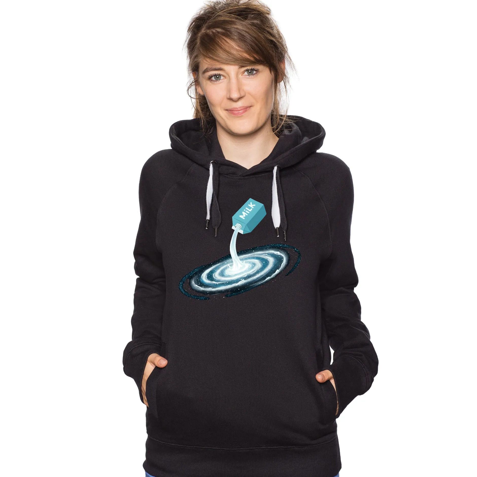 Zwischen Milch und Licht existiert im Universum natürlich nur Dunkelheit, weswegen es dieses Shirt ausschließlich in Schwarz gibt.