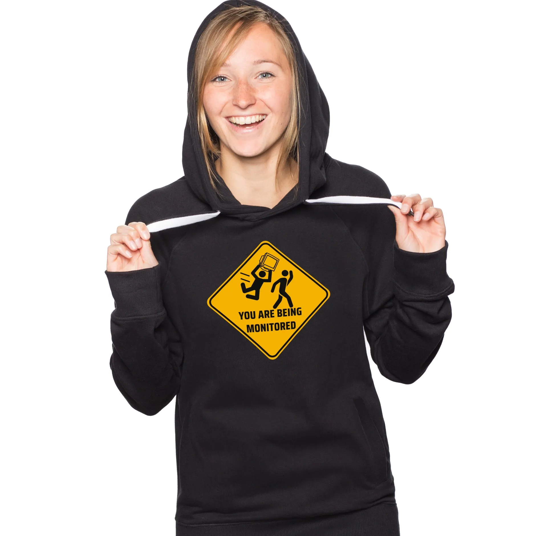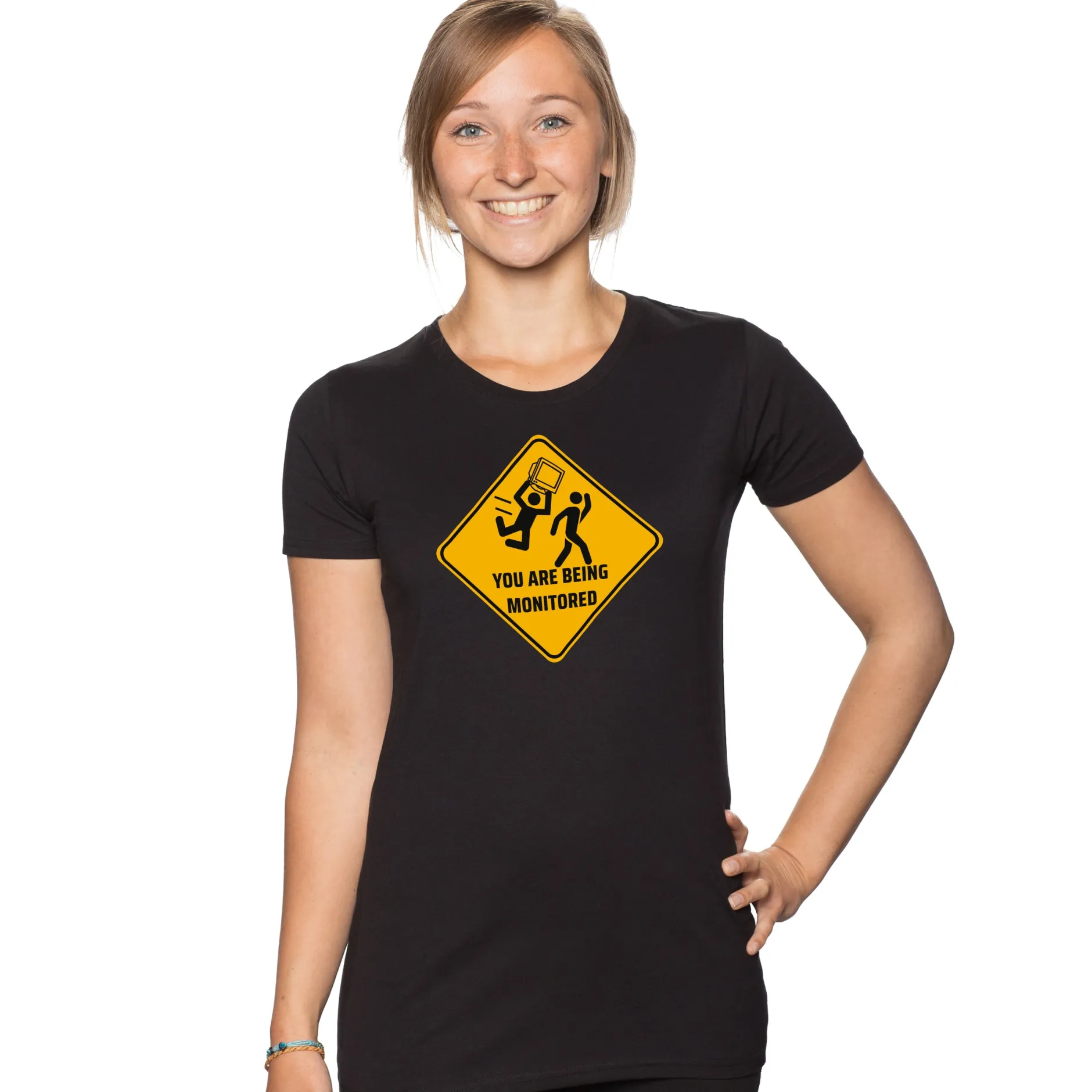 Die Grafik auf dem T-Shirt zeigt im Stil eines typischen Warnschildes eine Szene, in der eine Person von einer anderen mit einem Computermonitor „überwacht“ wird. Es ist eine witzige Darstellung, die die Schwere des Überwachungskonzepts aufbricht und ins Absurde zieht. Ideal für Technikbegeisterte, Datenschützer und alle, die einen guten visuellen Witz zu schätzen wissen.