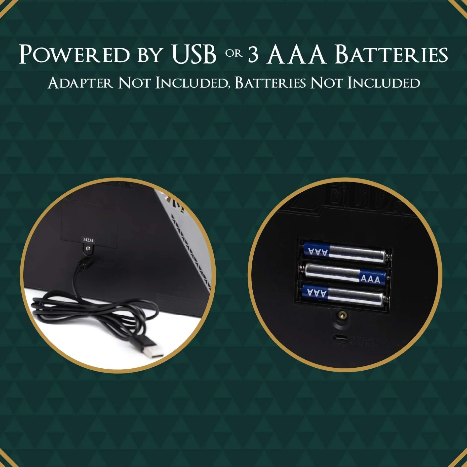 Die ikonische Triforce-Form leuchtet im typischen goldenen Glanz und kommt in einem edlen schwarzen Kunststoffgehäuse mit dekorativen Verzierungen. Sobald das Licht eingeschaltet ist, erscheint das Wappen des Königreichs Hyrule durch die seitlichen Projektionsflächen – ein echter Hingucker für alle, die die Welt von Zelda lieben. Die Stromversorgung erfolgt flexibel via USB oder durch 3 AAA-Batterien (beides nicht im Lieferumfang enthalten), und der Touch-Knopf auf der Rückseite macht die Bedienung kinderleicht – ob beim Einschlafen, beim Zocken oder einfach als stylischer Akzent im Regal.