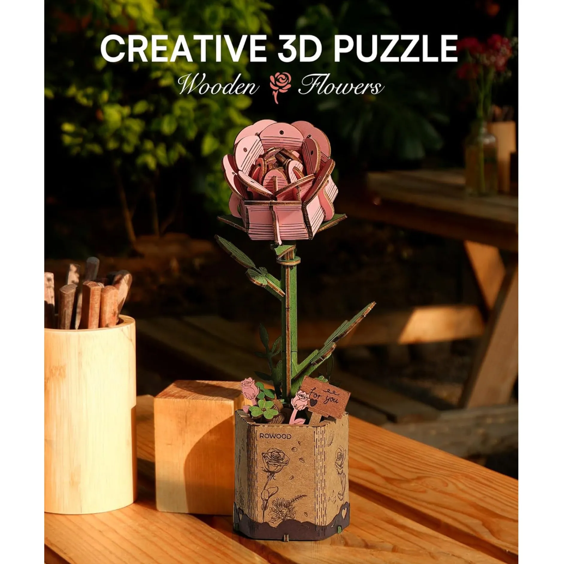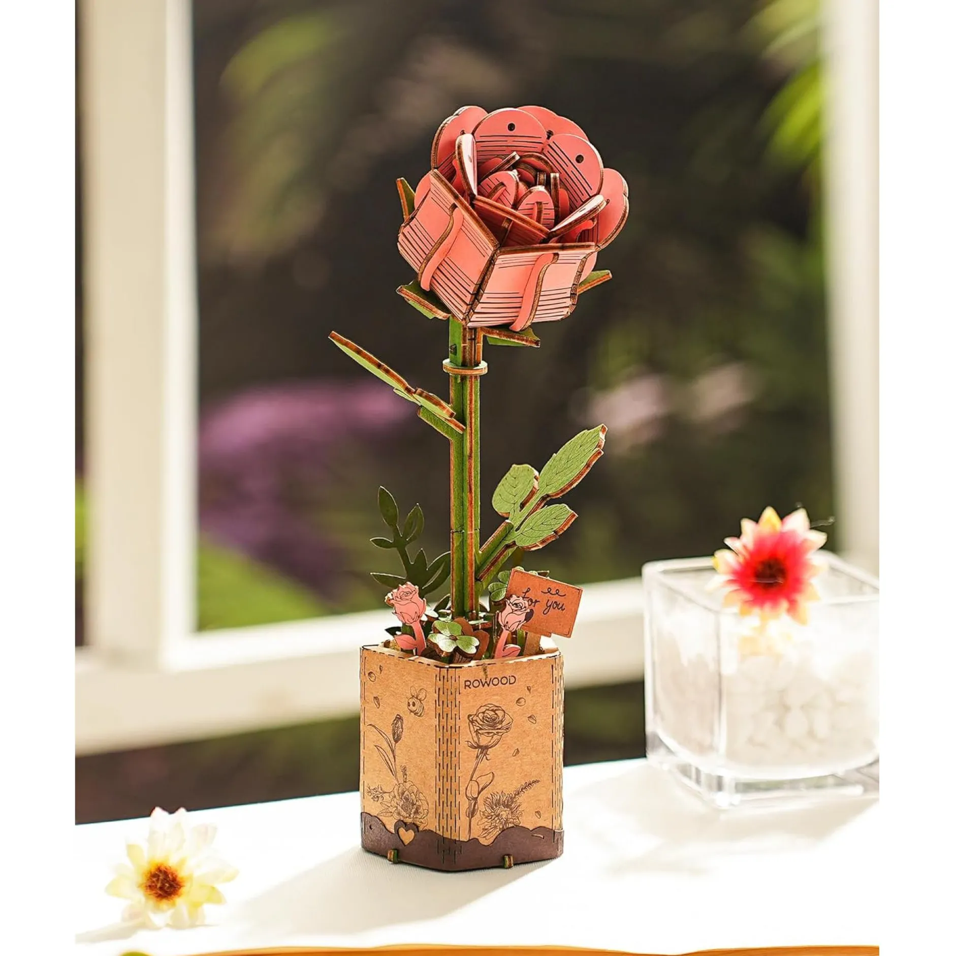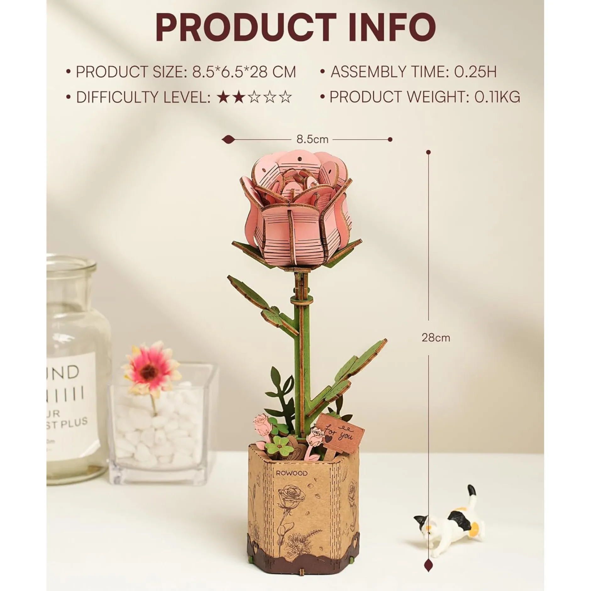 Die 104 vorgeschnittenen Teile aus lasergeschnittenem, vorgefärbtem Holz lassen sich ohne Kleber oder Werkzeuge zusammensetzen. Dank cleverer Konstruktion kannst du sogar Blütenwinkel und Stiellänge individuell anpassen. Der Topf ist liebevoll graviert, mit kleinen Extra-Blumen und einem Schildchen, das Platz für eine persönliche Botschaft lässt. Nach dem Zusammenbau misst die Rose ca. 28cm in der Höhe – ein schlanker, eleganter Blickfang für Schreibtisch, Regal oder Fensterbank.
