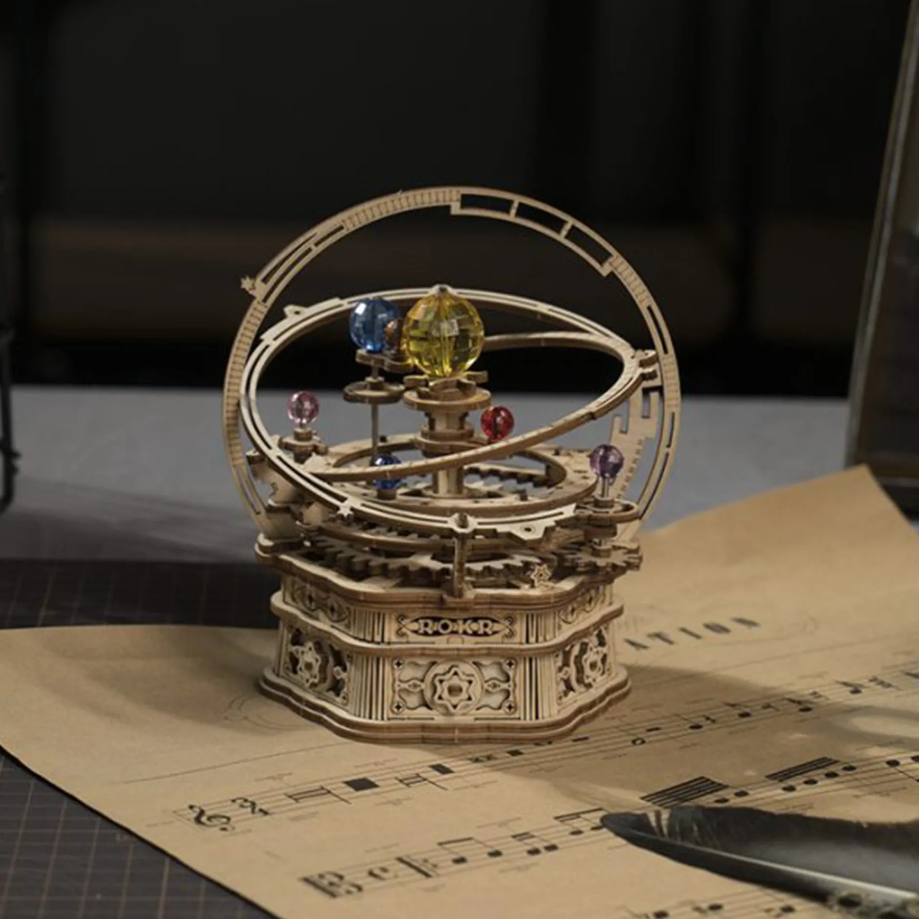 - Dreidimensionales Holzmodell eines Planetensystems, das sich zur Melodie der eingebauten Spieluhr bewegt
