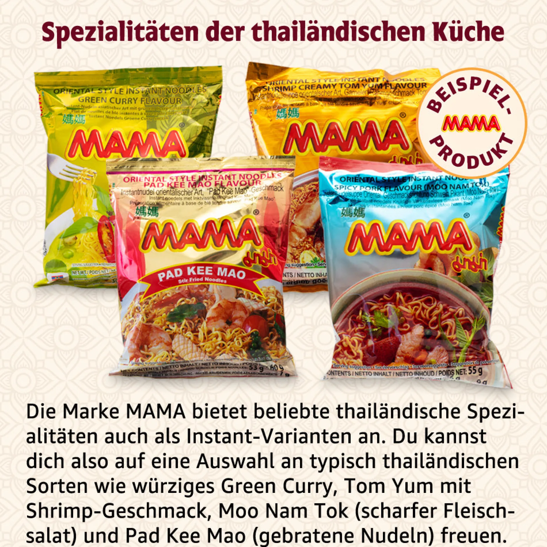 - Inklusive Gratis-Broschüre mit spannenden Hintergrundinfos zur thailändischen Esskultur, sowie Zubereitungstipps und Rezeptideen für die Instant-Nudeln