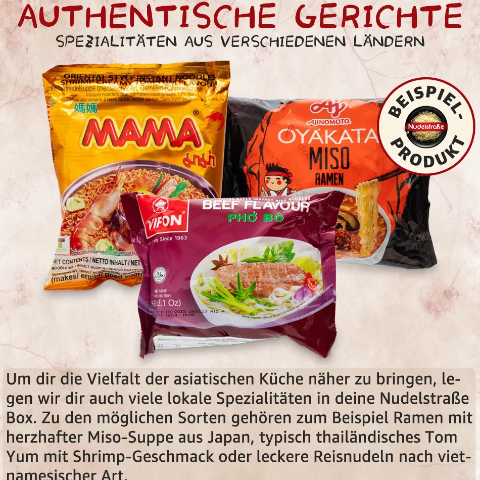 Diese werden von uns besonders sorgsam ausgewählt, damit du eine perfekte Kombination aus unterschiedlichen Geschmacksrichtungen und Marken kennenlernen kannst. Von thailändischem Tom Yum über japanische Miso-Suppe mit Soba bis hin zu typisch koreanischem Ramyun mit scharfer Chilisoße und indonesischem Mie Goreng ist für jeden Geschmack etwas dabei. Natürlich findest du auch Klassiker wie Chicken, Vegetable, Duck oder Sesam in der Box.