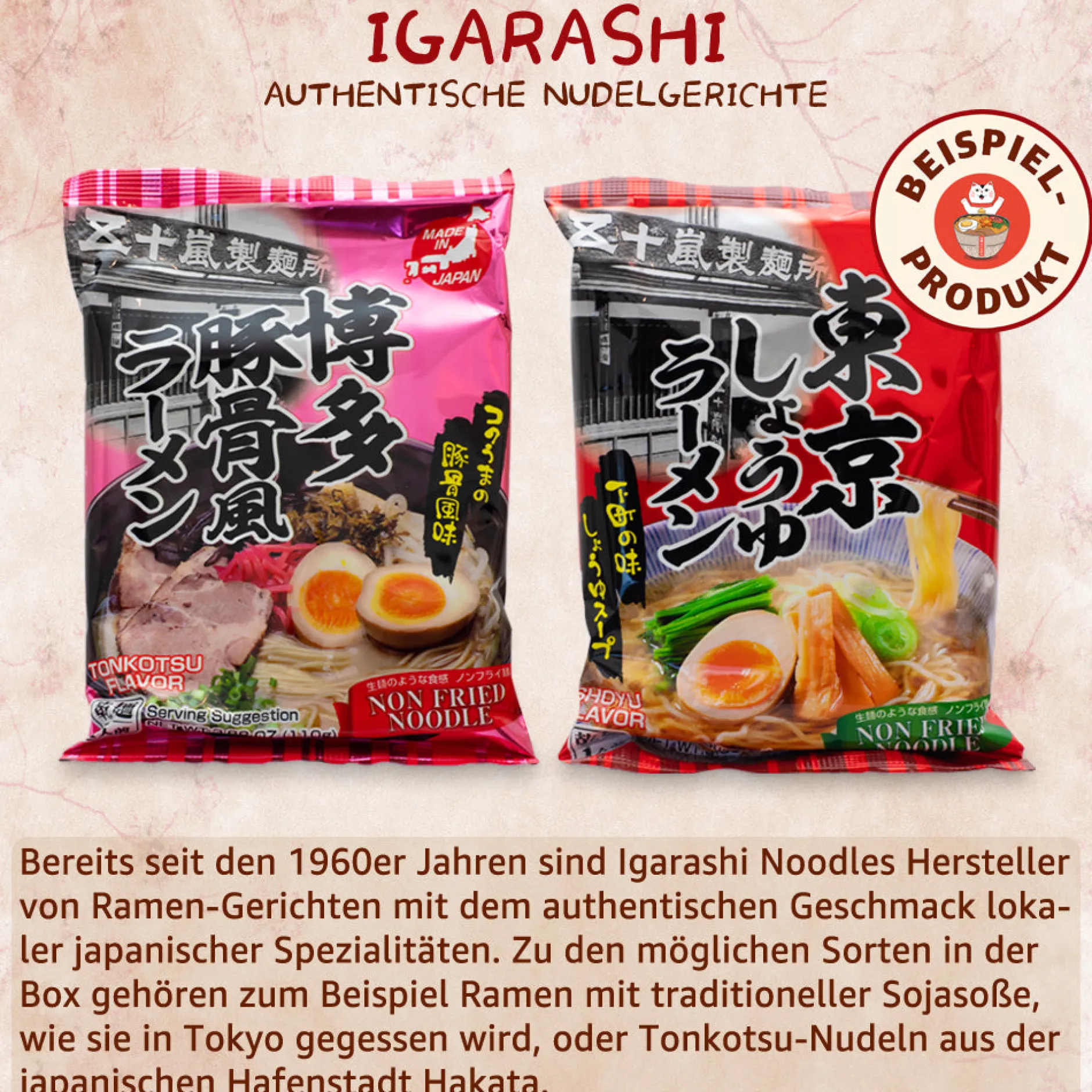 Mit dieser Ramen-Box reist du zum Ursprung der Instant-Nudeln, nämlich nach Japan! Dort gelang es Momofuku Ando vor über 60 Jahren zum ersten Mal frische Nudeln durch Frittieren haltbar zu machen. Während er sie eigentlich als Notnahrung für Krieg oder Umweltkatastrophen gedacht hatte, sind Instant-Ramen heute vor allem deswegen beliebt, weil sie so einfach zuzubereiten und trotzdem lecker sind.