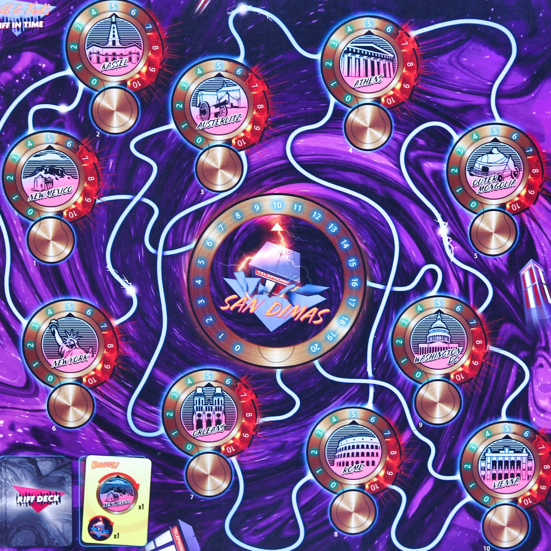 In Bill & Ted’s Riff in Time – Das verrückte Brettspiel schlüpfen du und deine Mitspieler:innen in die Rollen der Bandmitglieder und versucht, mithilfe von Würfeln und Kartenziehen, das durch die Risse entstandene Tohuwabohu, zu ordnen und die Welt zu retten. Keine leichte Aufgabe, aber gemeinsam könnt ihr das schaffen.