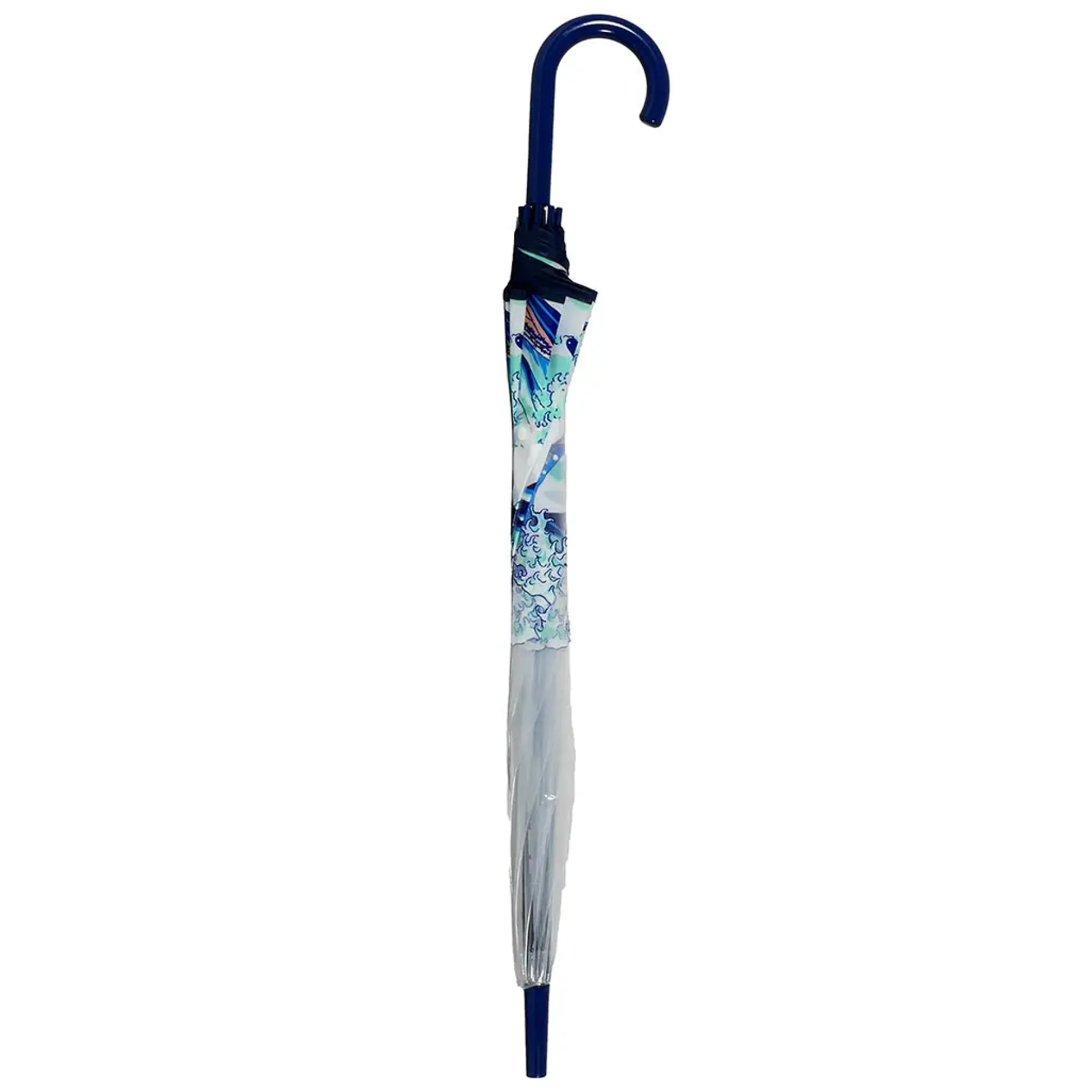 Dieser durchsichtige Stockschirm zeigt Katsushika Hokusais weltberühmten Holzschnitt „Die große Welle vor Kanagawa“ in leuchtenden Blau- und Weißtönen. Mit einem Durchmesser von 80 cm schützt er zuverlässig vor Regen, während das kuppelförmige Design auch bei Wind nicht so leicht einknickt. Der Griff in elegantem Dunkelblau passt perfekt zum Design und sorgt für einen sicheren Halt. Hergestellt aus stabilem Kunststoff und Metall bringt der Schirm gerade einmal rund 300 g auf die Waage – leicht genug für unterwegs, aber stabil genug für ernsthafte Wetterkapriolen.