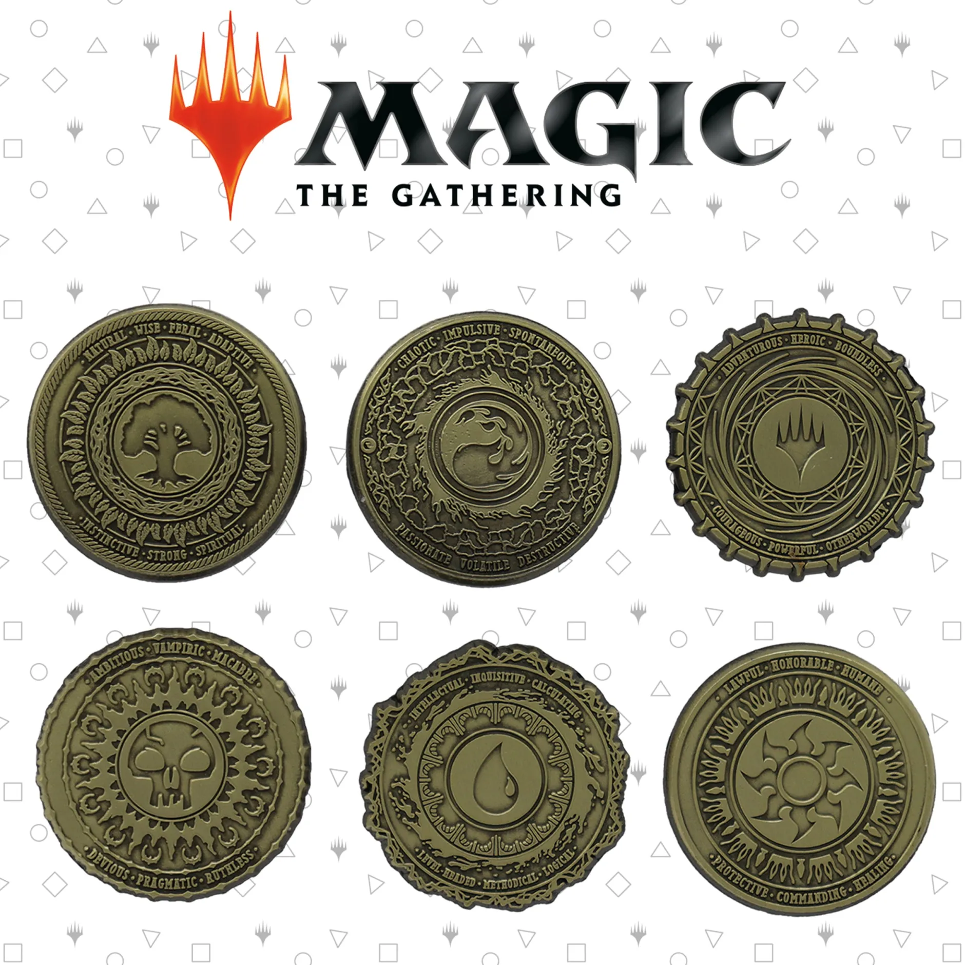 - 6 edle Metallanstecker mit den Mana-Symbolen und dem Zeichen des Planeswalkers aus dem Spiel „Magic: The Gathering“