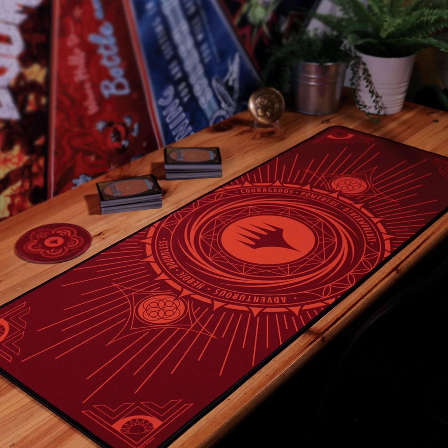 Letzteres nimmt in deiner Wohnung deutlich weniger Platz in Anspruch, denn der Stauraum für die unzähligen Kartensets fällt natürlich weg. Andererseits fehlt es vorm PC oft an der magischen Atmosphäre, die an einem von kunstvoll gestalteten Karten bedeckten Tisch aufkommt. Mit dem Magic XL Mauspad und Untersetzer Set kannst du dem entgegenwirken. Beide sind mit dem Planeswalker-Symbol geschmückt und in feurigem Rot gehalten. Dank der Unterseite aus rutschfestem Gummi können sie auch im Eifer des hitzigsten Zaubergefechts nicht verrutschen.