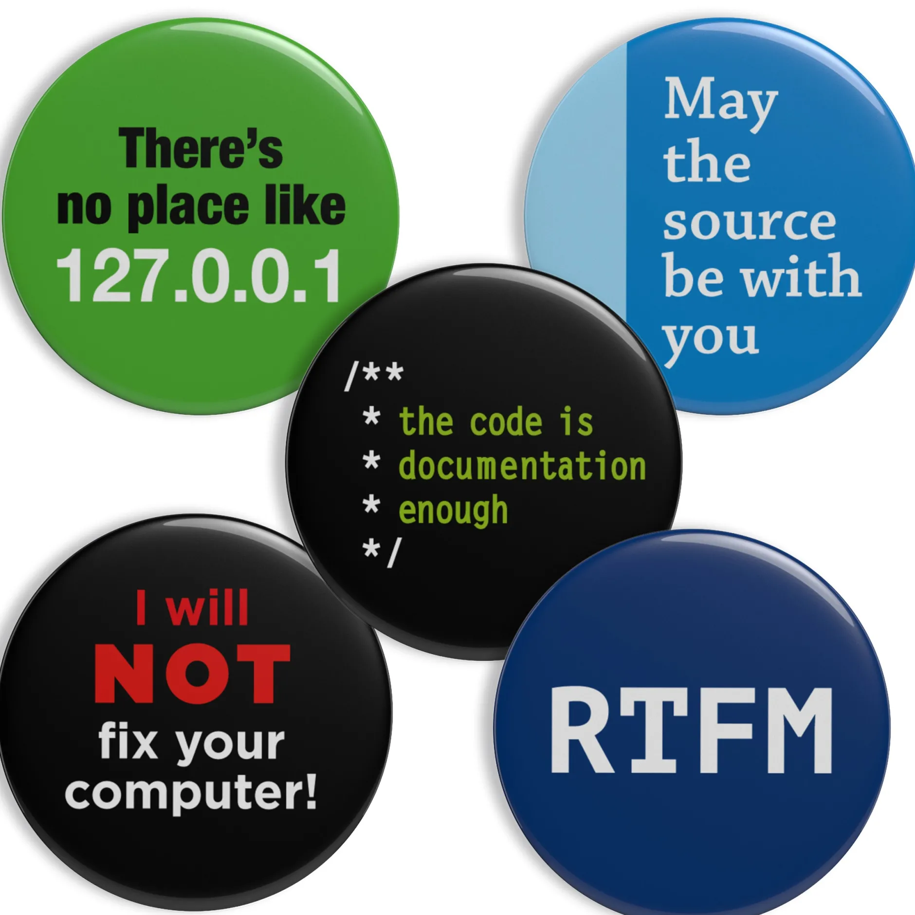 Unsere Geek Buttons zum Thema IT greifen die Dinge auf, mit denen sich die heimlichen Helden des Alltags regelmäßig rumschlagen müssen. Auf den fünf Buttons, die in diesem Bundle enthalten sind, findest Du Sprüche, die gefühlt 99% der Anfragen an die IT abdecken sollten: Nein, wir reparieren keine Computer, lies das Handbuch durch, guck dir den Code genau an. Außerdem ist eine Button-Plakette für die Heimatbasis der ITler und der Segensspruch ihrer Gottheit enthalten. May the source be with you!