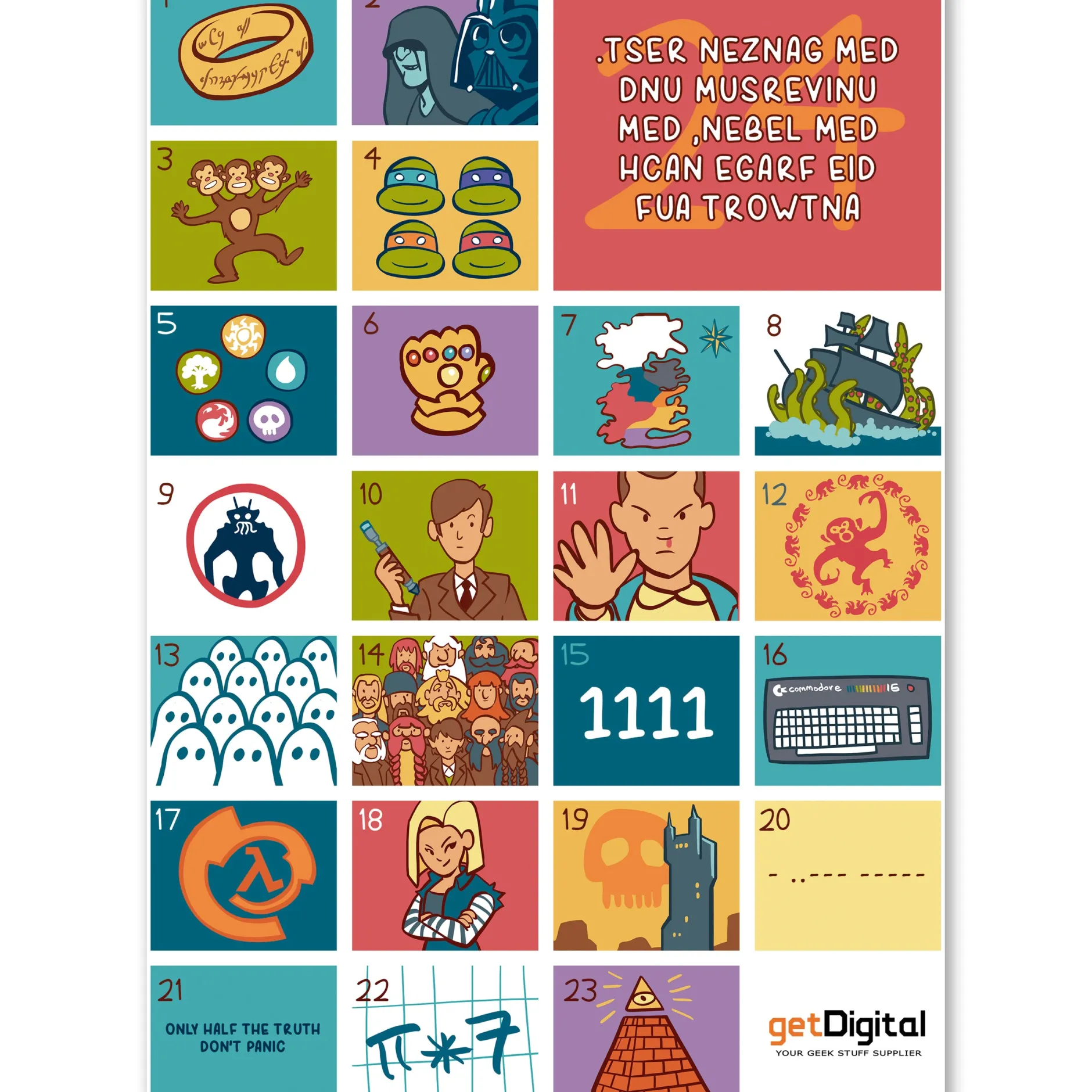 Dürfen wir vorstellen: die Adventskalender-Aufkleber! Dieses Set enthält 24 nummerierte und farbige Aufkleber, mit denen Du Deine liebevoll eingepackten Geschenke kennzeichnen kannst. Neben der Zahl des jeweiligen Tages zeigt jeder Aufkleber ein nerdiges Motiv mit direktem Bezug auf den jeweiligen Tag. So zeigt die Drei beispielsweise einen dreiköpfigen Affen und die Fünfzehn den Binärcode für „15“.