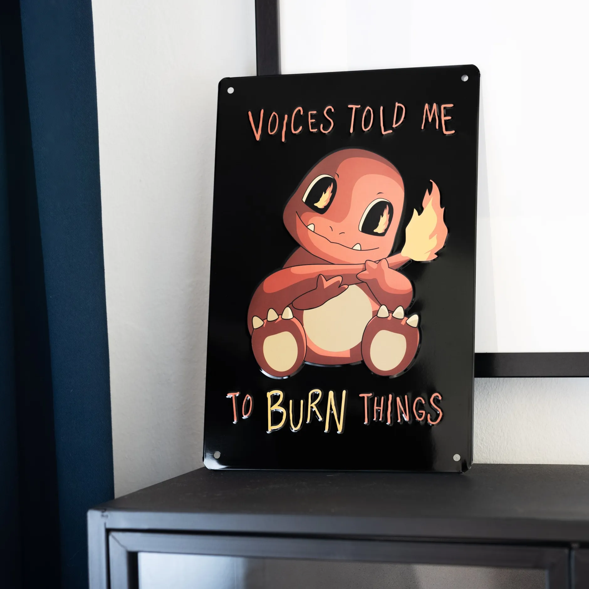 Mit Blick auf das Blechschild Voices Told me to Burn Things erscheint diese unheimliche Annahme leider durchaus plausibel. Denn die kleine Echse, die mit leicht irrem Grinsen ihre lodernde Schwanzspitze liebkost, sagt eindeutig: „Voices told me to burn things.“ (In etwa: Die Stimmen haben mir gesagt, dass ich Dinge verbrennen soll.) Na gut: Manche kämpfen für Ehre, manche für Ruhm – und manche sind einfach nur ein bisschen [i]speziell[/i]. 😉 Das Blechschild zu Ehren des durchgeknallten Monsters kannst du übrigens ganz einfach mit Schrauben, Nägeln oder doppelseitigem Klebeband (nicht enthalten) an der Wand befestigen.