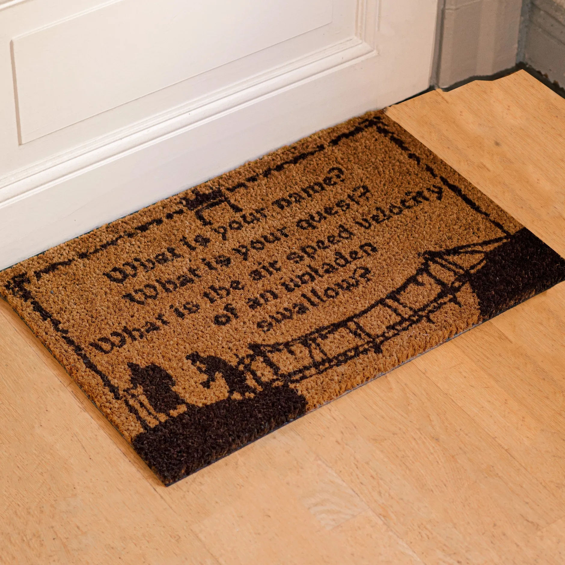- Fußmatte mit den 3 Fragen, die Artus vor der Brücke des Todes im Film „Die Ritter der Kokosnuss“ gestellt werden