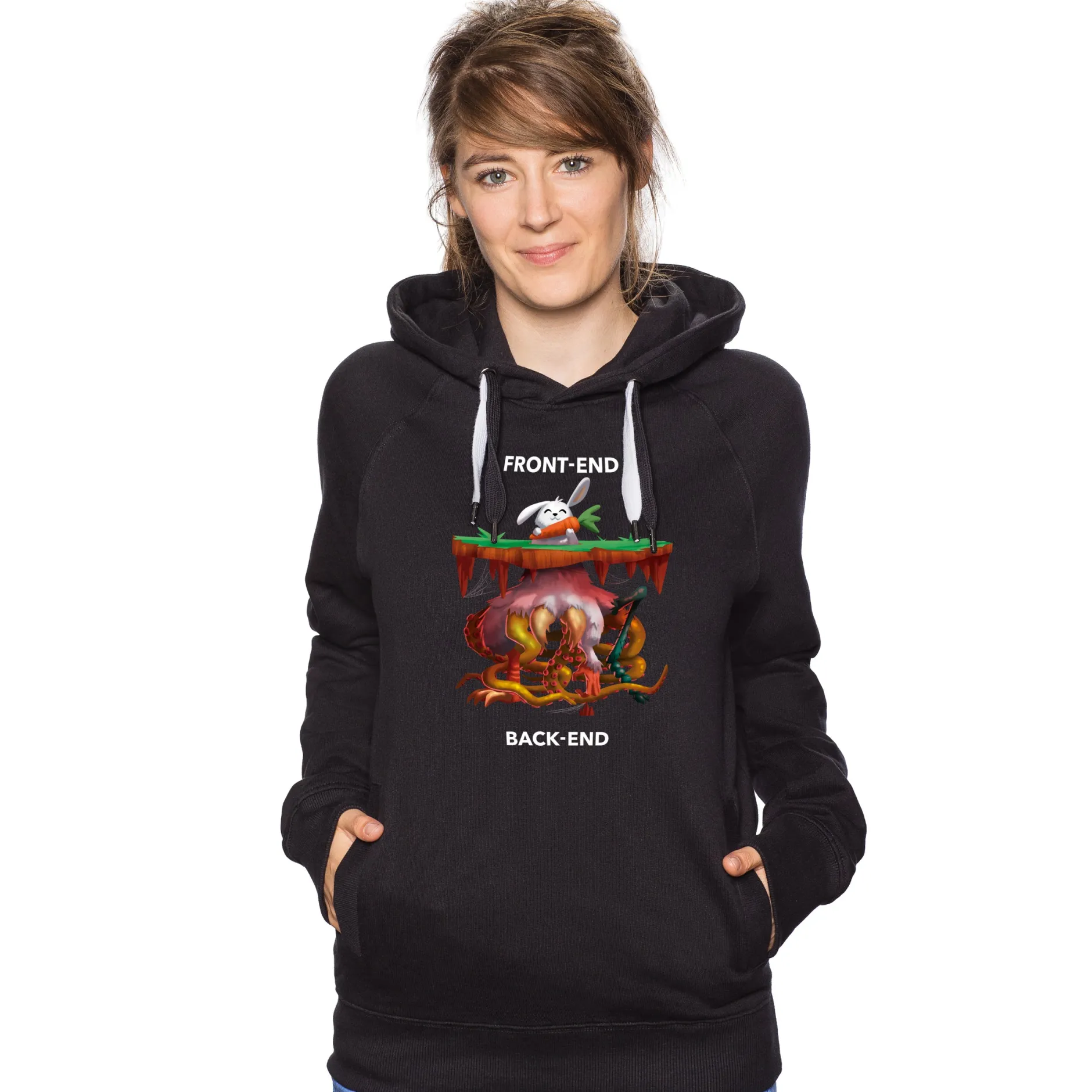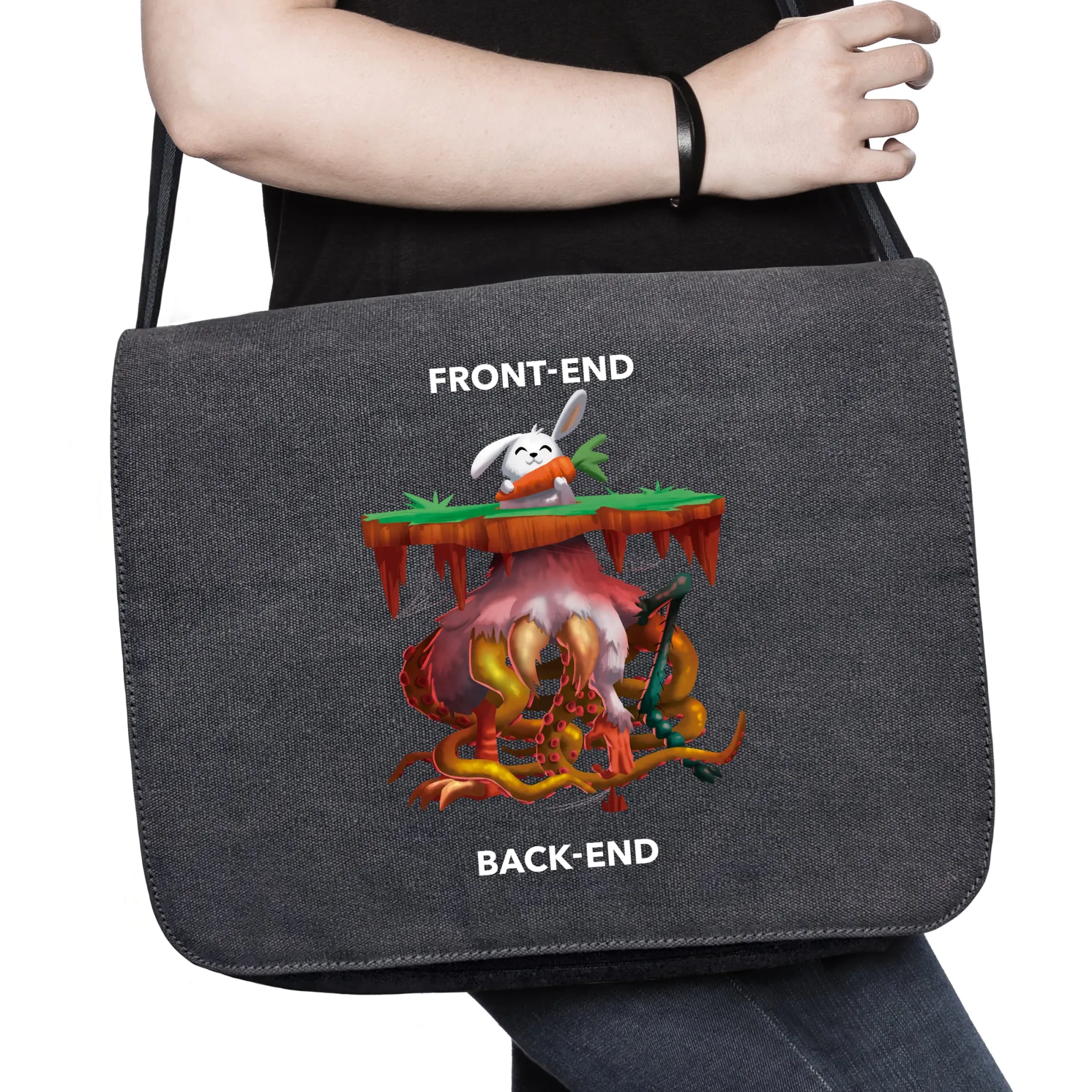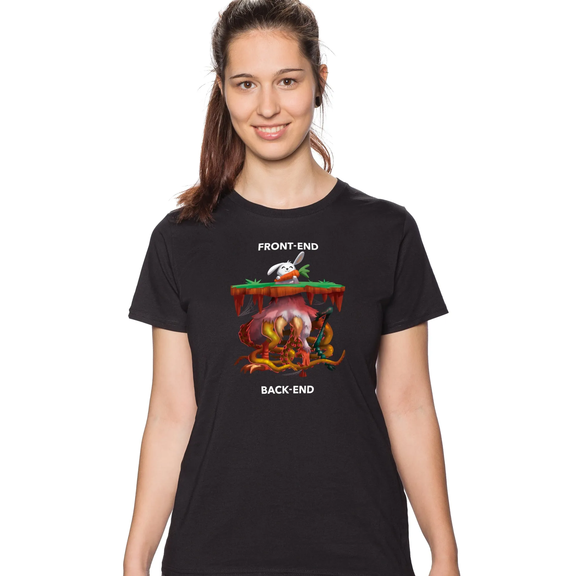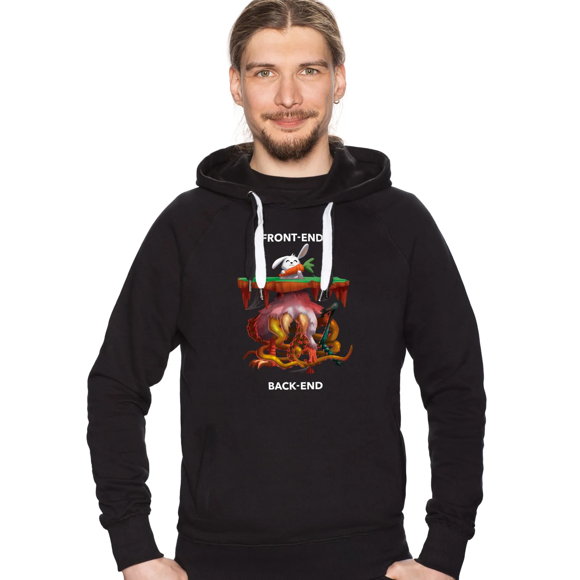 Das „Front End – Back End“-Shirt zeigt genau solch ein Monster. Auf den ersten Blick sieht man nur ein niedliches Kaninchen, das eine Möhre hält und nichts Böses im Schilde führt. Unter der Oberfläche lauert aber ein abscheuliches Monster, das Dich ins Verderben stürzen will. Zum Glück gibt es ja tapfere Coder, die sich ins Gefecht stürzen und Dir das schöne, ungefährliche Front End überlassen. 🙂