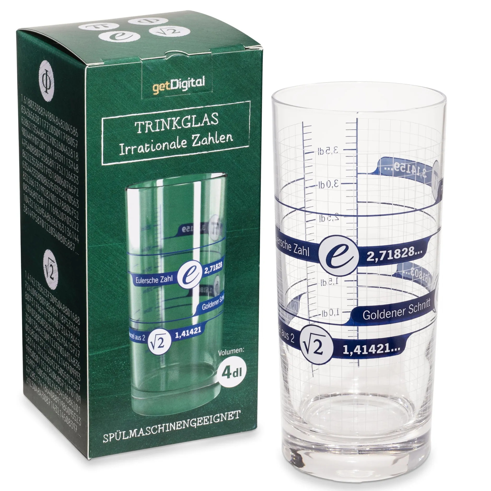 Klar, im Alltag ist es einfacher, mit natürlichen Zahlen zu arbeiten. Aber dabei geraten die wirklich coolen Zahlen, die Mathematikgeschichte geschrieben und zu allerlei Fortschritten auch außerhalb der Mathematik geführt haben, sehr in den Hintergrund. Du als echter Mathegeek kannst der alltäglichen Vernachlässigung irrationaler Zahlen jetzt entgegenwirken – ganz einfach durch dieses Trinkglas!