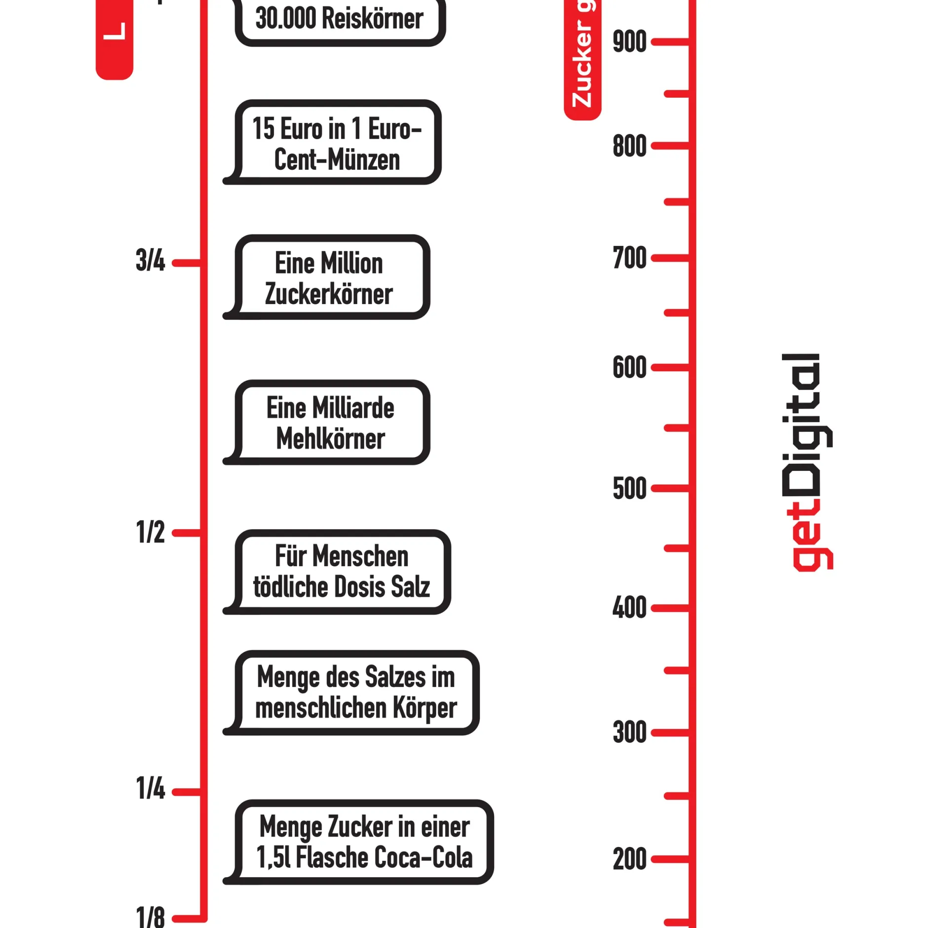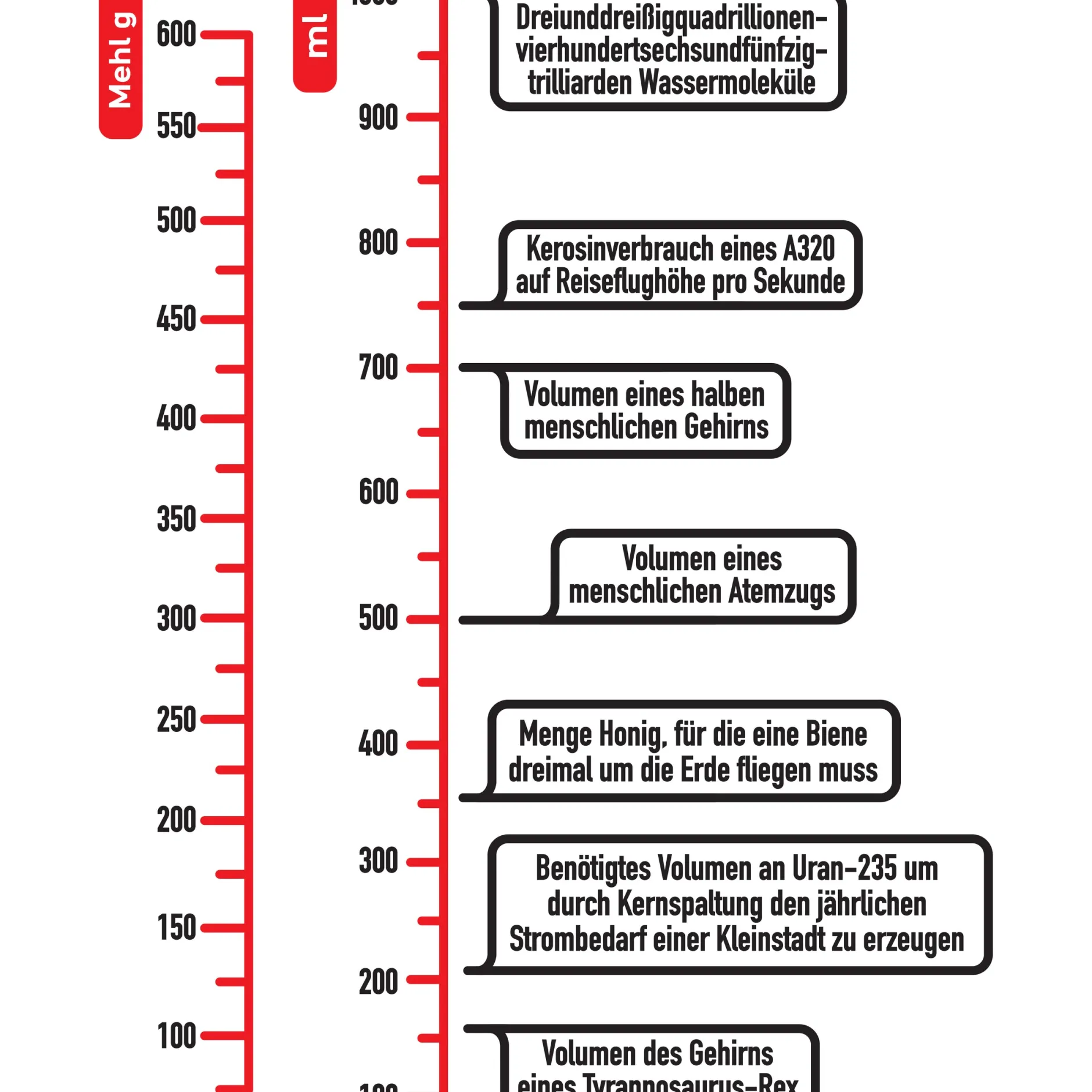 Da Messbecher in der Regel recht langweilig sind, haben wir mit dem Wissenschafts-Messbecher eine Variante entwickelt, bei der du auch noch jede Menge lernen kannst! Denn neben den üblichen Markierungen für Flüssigkeiten, Mehl und Zucker weist der Becher auch noch 14 Fun Facts auf! Wüsstest du auf Anhieb, wie viel Kerosin eine A320 auf Reiseflughöhe per Sekunde verbraucht? Oder wie viel Platz 30.000 Reiskörner einnehmen? Ab sofort bist du für spontane Fragen dieser Art bestens gewappnet!