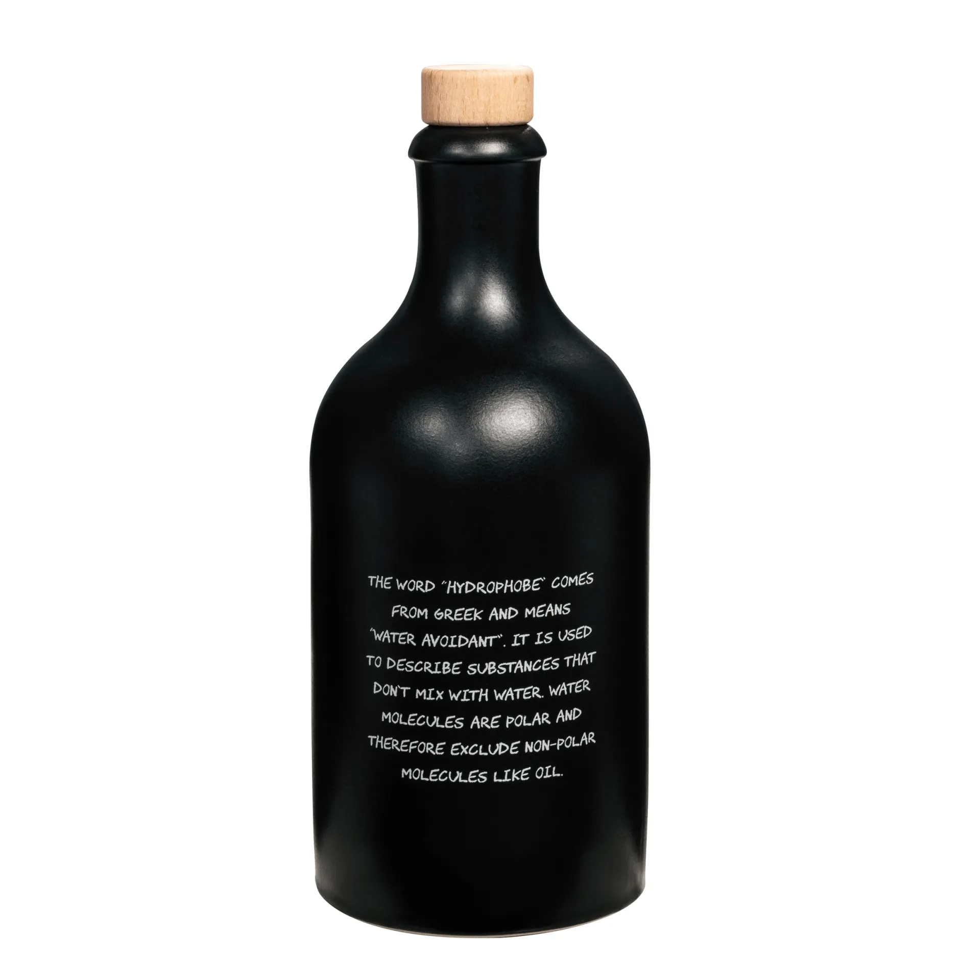 Auf der Rückseite der Steinzeugflasche, die neben Öl natürlich auch mit anderen Flüssigkeiten befüllt werden kann, wird der chemische Hintergrund des Witzes noch einmal auf Englisch erklärt, sodass Gäste in Deiner Küche sich nicht die die Blöße geben müssen. 😉