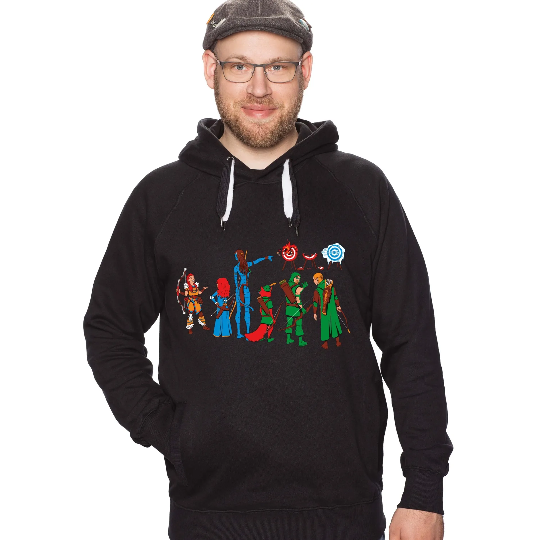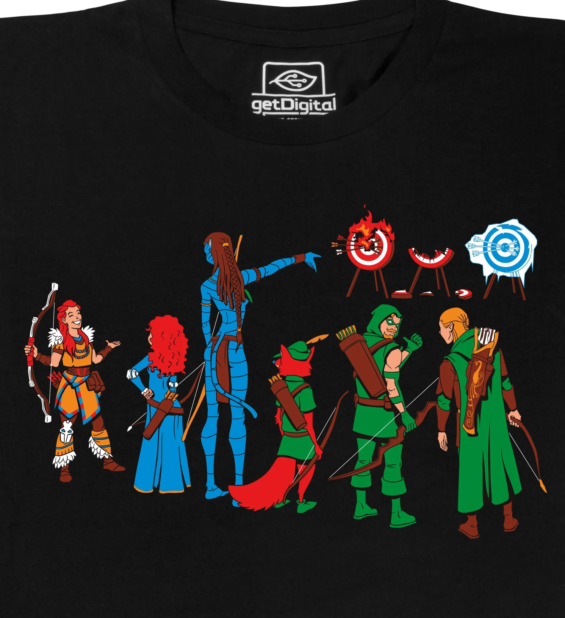 Merida, Robin Hood, Green Arrow … ein Wettkampf wahrer Meisterschützen aus Film, Spielen und Comics! So etwas würde wahrscheinlich Ewigkeiten dauern, weil immer alle Pfeile in der Mitte der Scheibe landen. Vielleicht hat Aloy deswegen und mit voller Absicht ihre Elementarpfeile benutzt: Ihr wurde einfach zu langweilig. Zumindest wirkt die tapfere Roboterjägerin nicht ganz so aufgeregt wie ihre Konkurrenz, wie man auf dem Bogenschützen-Motiv sehen kann.