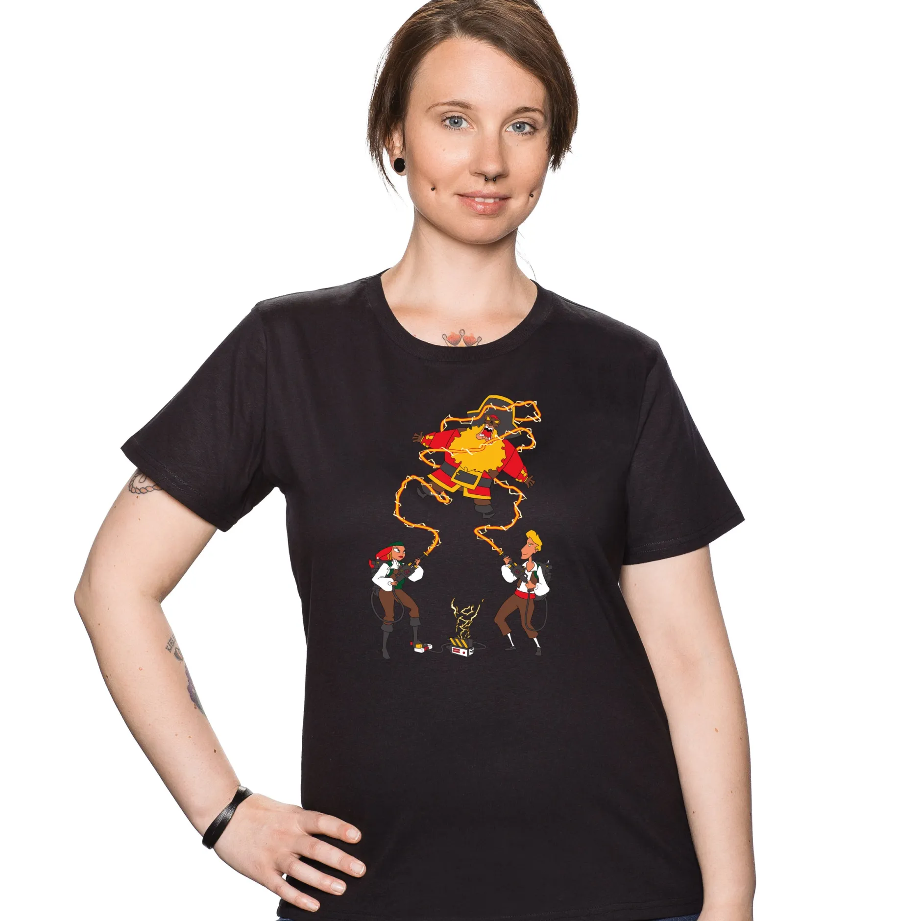 Das T-Shirt „Ghost of Monkey Island“ kombiniert auf kreative Weise Elemente der beiden ikonischen Franchises „Monkey Island“ und „Ghostbusters“. Es zeigt eine Szene, in der die Figuren Guybrush Threepwood und Elaine Marley aus „Monkey Island“ gegen einen Geist kämpfen, der an den berüchtigten Piratenantagonisten „LeChuck“ aus demselben Spiel erinnert.