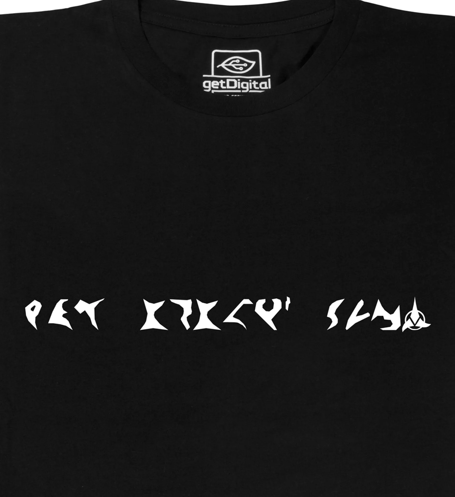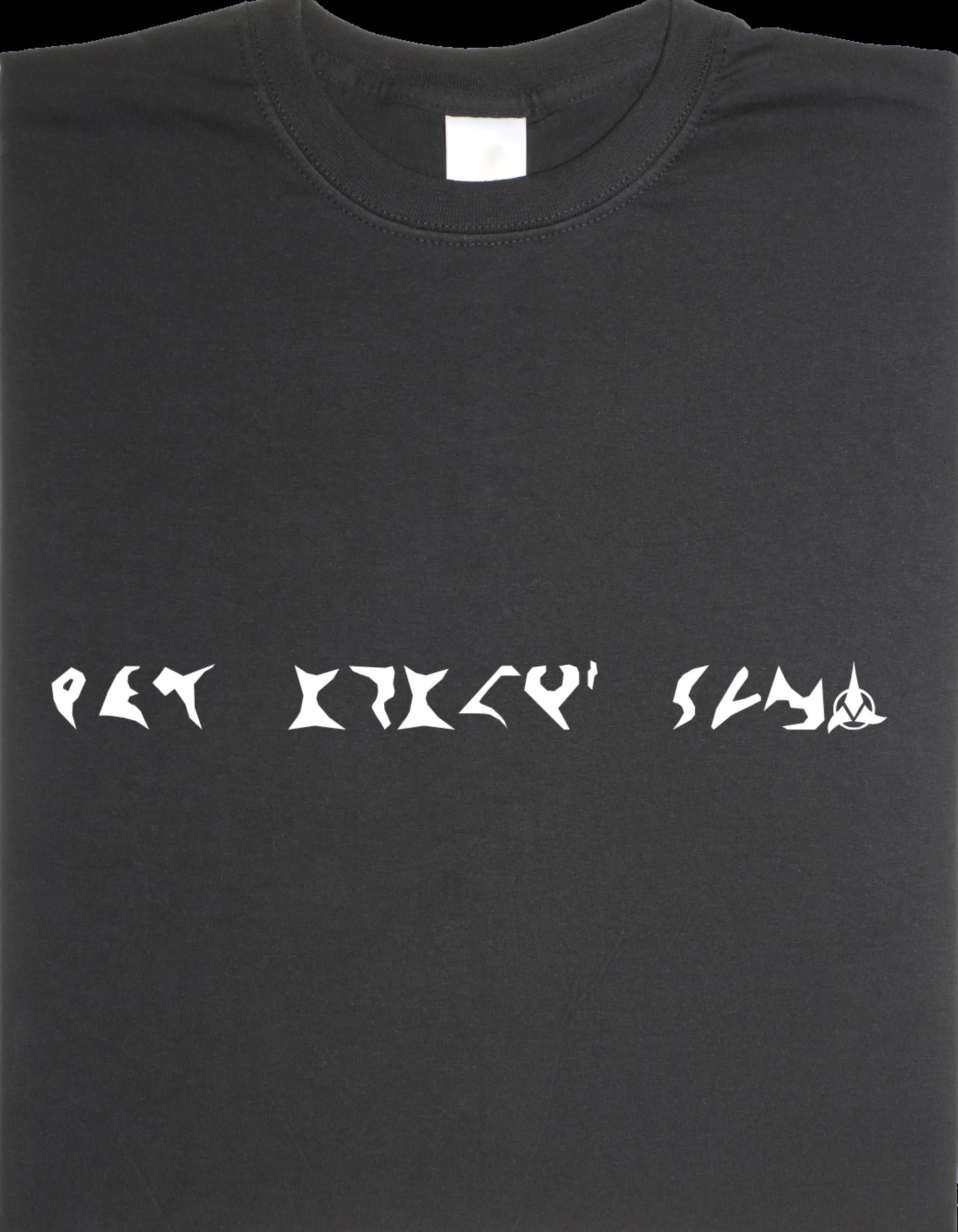 Auch wenn es wohl die wenigsten lesen können: Auf diesem Shirt steht die schlimmste Beleidigung überhaupt – zumindest für Klingonen. Es handelt sich nämlich um ein Zitat aus Star Trek, das sich dort Klingonen an den Kopf werfen. In Star Trek wurde für die wilden Krieger nämlich eine eigene Sprache und Schrift entwickelt. Auf dem Shirt steht nun: