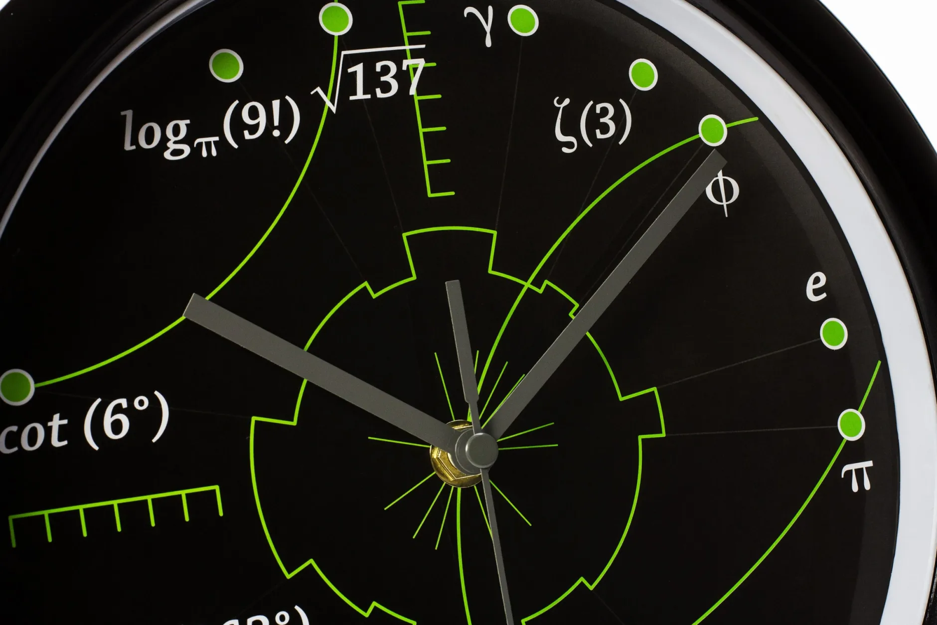 Wie dem auch sei: Wer ein echter Mathefreak sein will, der braucht unbedingt die Matheuhr 2.0. Im Gegensatz zu Version 1.0 ist diese quasi das Fortgeschrittenen-Modell, denn sie ist noch schwieriger zu lesen. Alle Uhrzeiten sind durch mathematische Formeln oder Konstanten verschlüsselt und die Ergebnisse nicht zwangläufig grade. Wenn man also die ganz exakte Zahl herausbekommen will, muss man schon ein bisschen rechnen 😉 Oder weißt Du gar aus dem Kopf, was die Apéry Konstante oder der natürliche Logarithmus der Primzahl 997 ist?