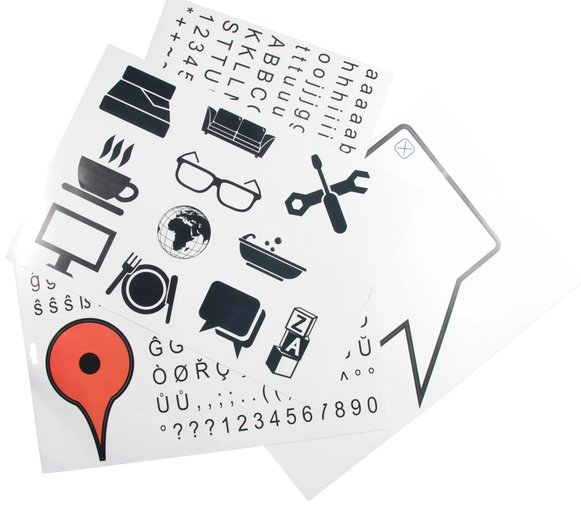 Dabei sind Deiner Fantasie kaum Grenzen gesetzt, denn den Inhalt der Sprechblase kannst Du selbst gestalten! Dazu stehen Buchstaben, Zahlen und Sonderzeichen sowie eine Reihe naheliegender Symbole (Sofa, Computer, Kaffeetasse usw.) zur Verfügung. Unter weitere Bilder kannst Du Dir die ganze Auswahl anschauen. Der Computer auf dem Foto ist übrigens nicht im Lieferumfang enthalten 😉