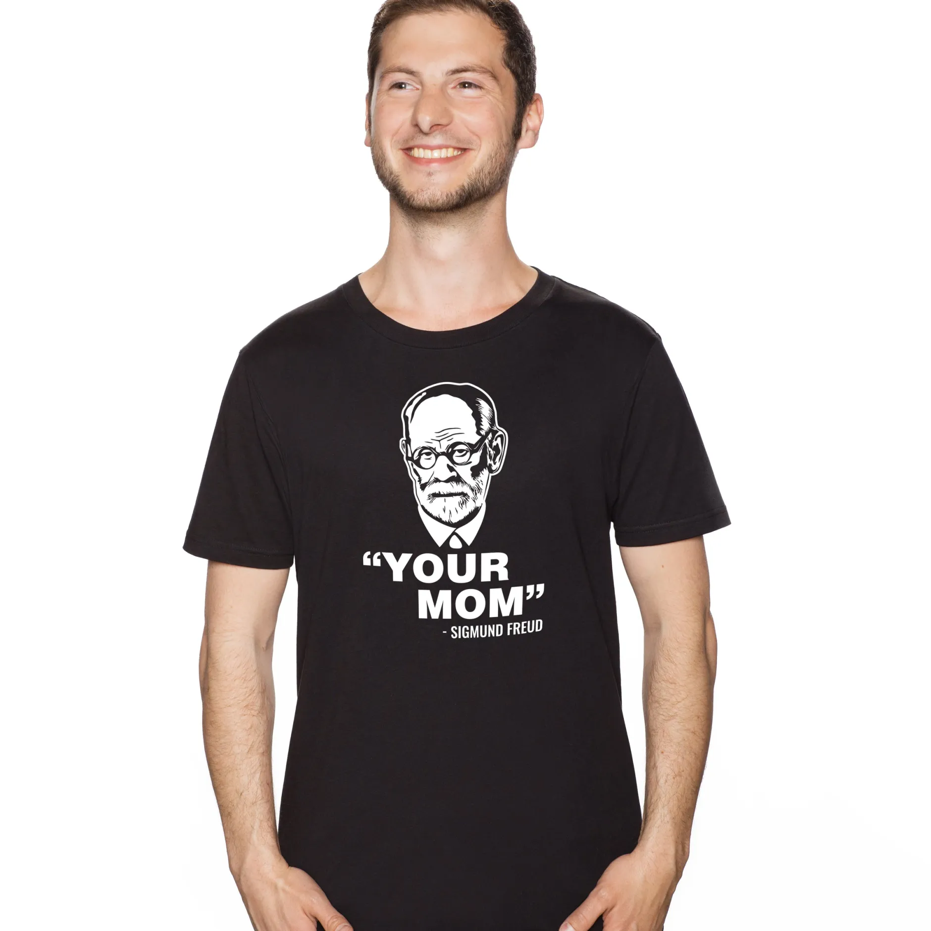 Obwohl wir Nerds normalerweise nichts mit der Psychoanalyse am Hut haben, sollten wir Freud dankbar sein. Warum? Das verrät Dir das „Deine Mutter“-Shirt: Er hat unbewusst den „Deine Mutter“-Witz erfunden! Ohne ihn würde wahrscheinlich niemand wissen, dass Deine Mutter so [ [i]hier Beleidigung einfügen[/i] ] ist wie [ [i]hier Vergleichspunkt einfügen[/i] ]! Ha, der hat gesessen, oder? Und falls Du nicht so kreativ bist, reicht auch ein einfaches „[i]Deine Mutter![/i]“. 😉