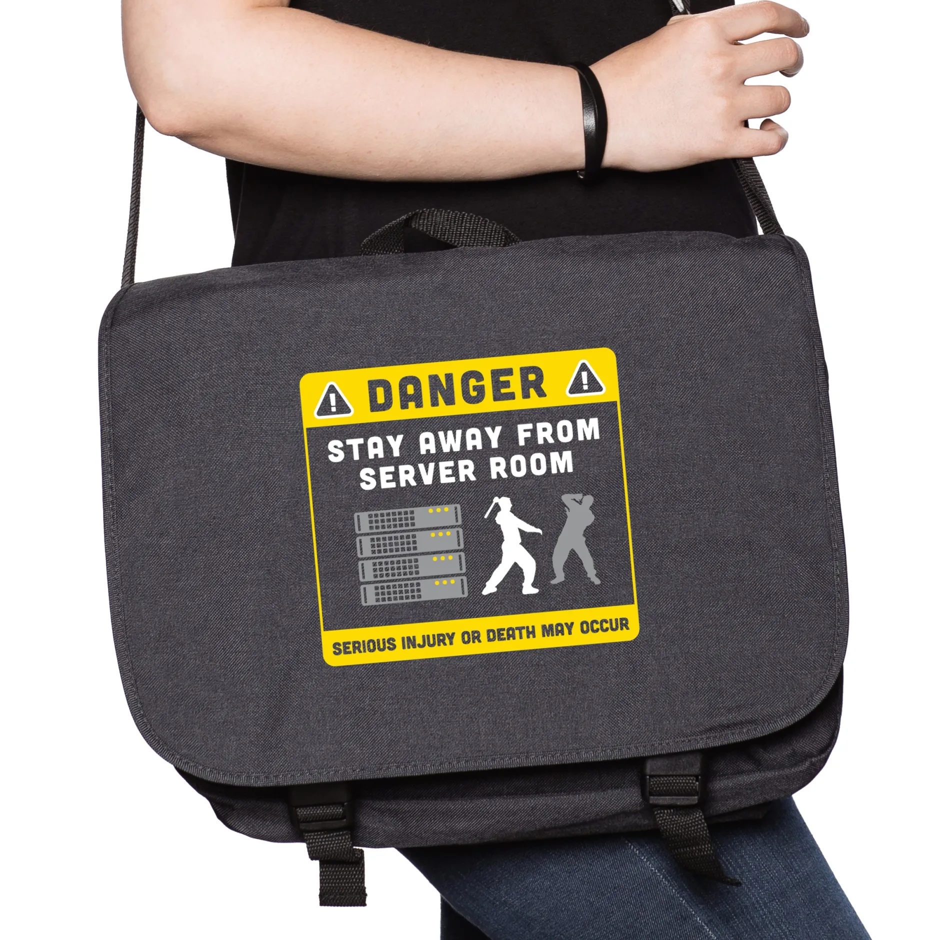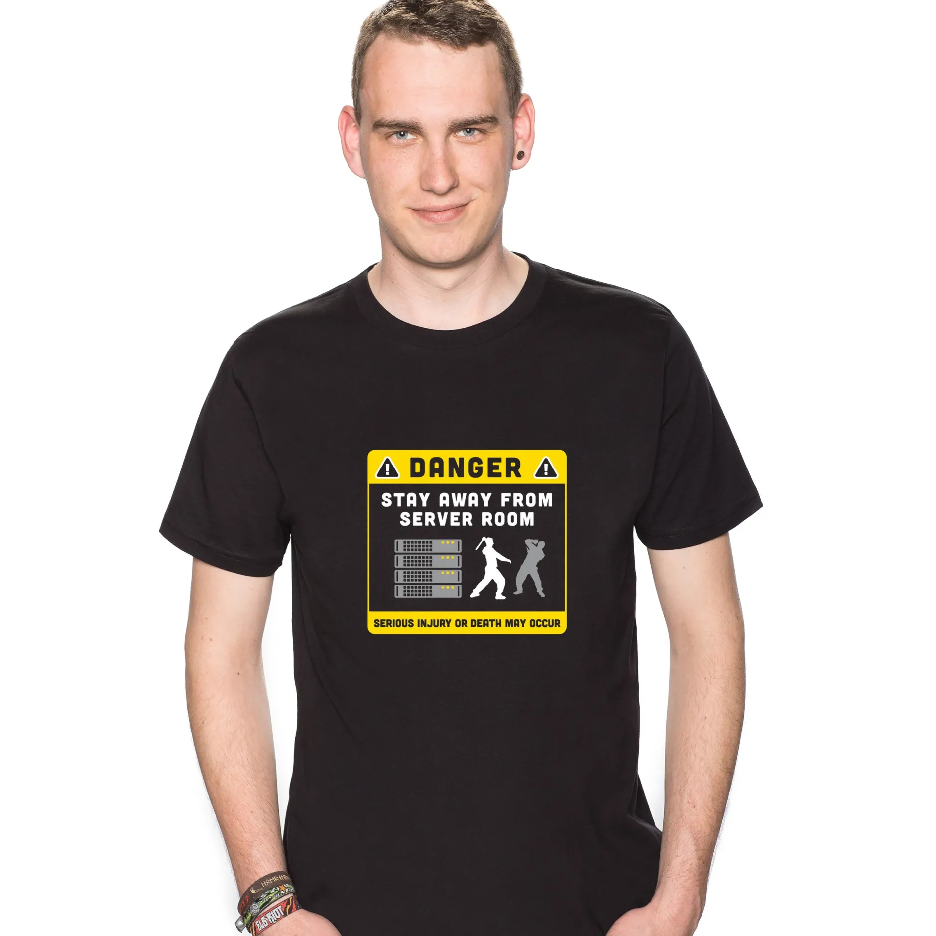 Und vielleicht ist er bewaffnet. Unterschätze nie einen Nerd. Vor allem nicht einen, der dieses “Stay away from Server” T-Shirt trägt!