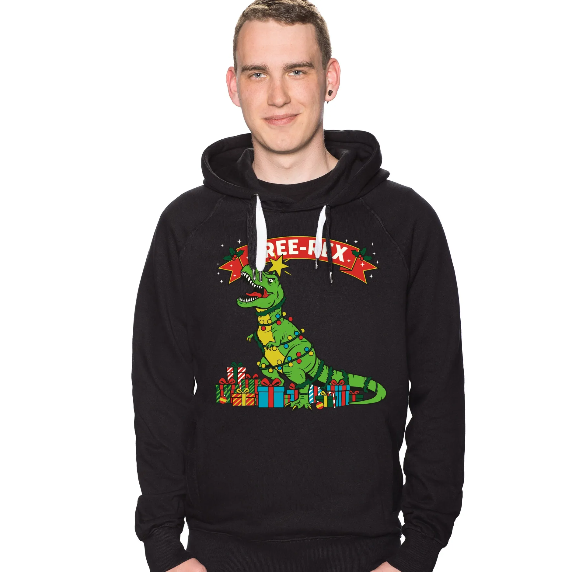 Man kann diskutieren, ob Weihnachtsbäume heutzutage wirklich nachhaltig sind. Also warum nicht einen Dinosaurier nehmen? Groß, grün, Lichterketten-tauglich… Okay, vielleicht ist er nicht ganz stubenrein. Vielleicht futtert er erst den Braten und dann fast die Familie. Aber auf diesem Shirt ist er als Tree-Rex völlig harmlos, festlich geschmückt und einfach zum Anschauen – versprochen!