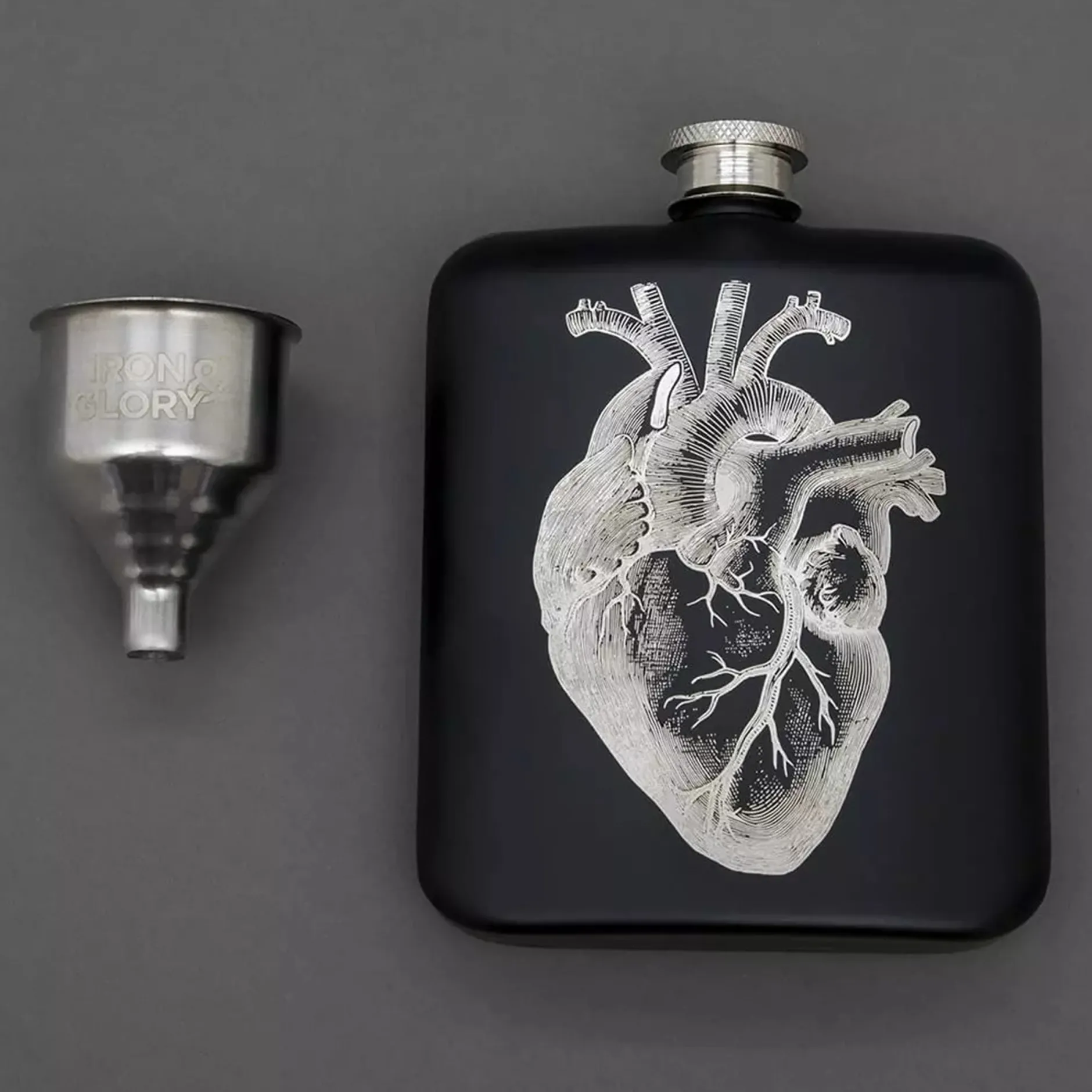 Der schwarze Stahl-Flachmann eignet sich perfekt für den Transport eines guten Tropfens und kann mit einem Drehverschluss verschlossen werden. Die Front ist mit einer Lasergravur verziert, die ein hochdetailliertes anatomisches Herz zeigt.