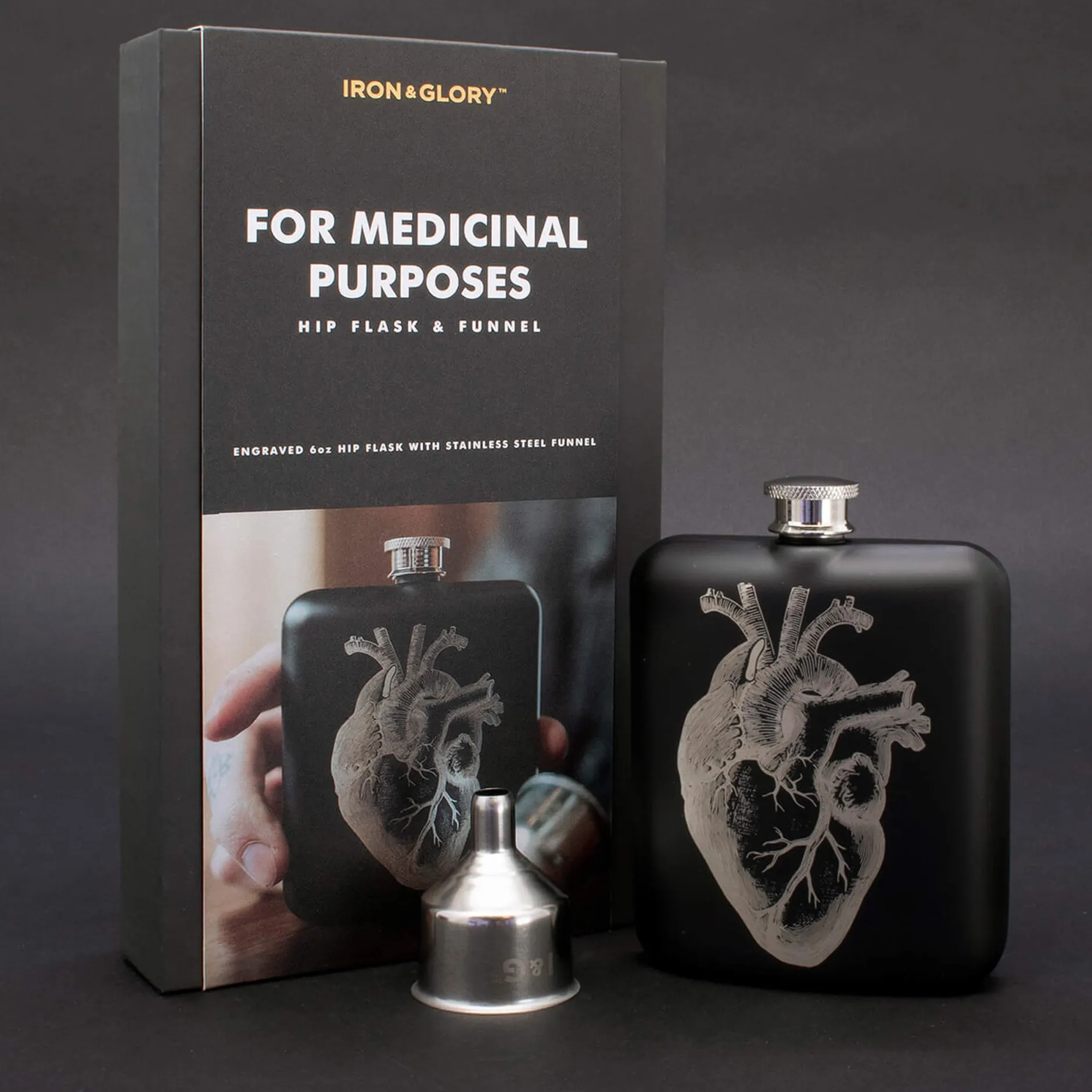 Ein Glas Rotwein ist ja bekanntlich gut fürs Herz. Überhaupt besteht zwischen Alkohol und Herzensdingen eine gewisse Verbindung: Der richtige Drink kann ein ängstliches Herz stärken, Herzschmerz lindern und einsame Herzen zusammenbringen. Der For Medicinal Purposes – Flachmann mit Abbildung eines anatomischen Herzens ist daher der perfekte Aufbewahrungsort für deinen Whiskey, Rum, Gin, oder was du sonst gern trinkst.