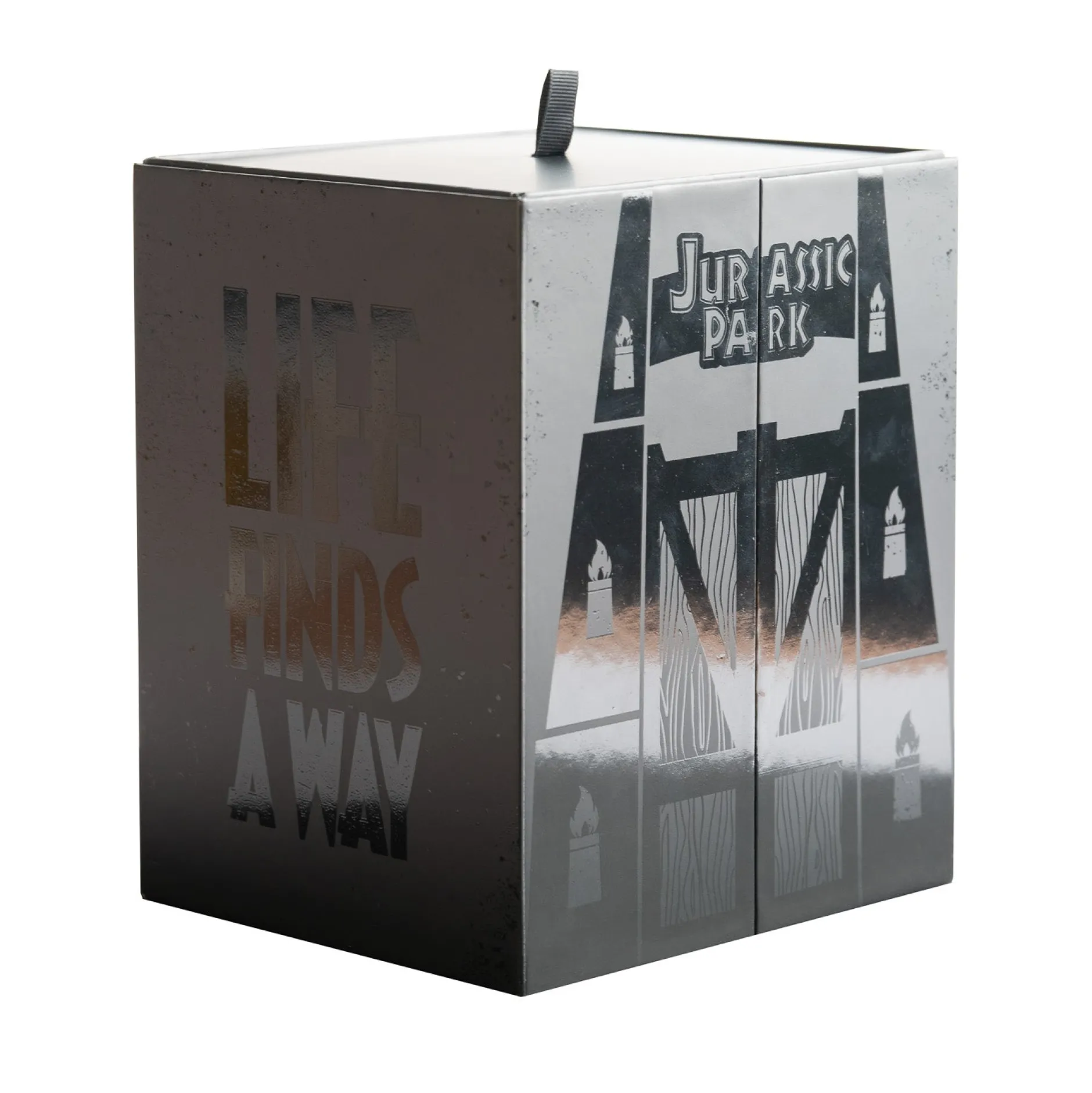 - steht auf einem steinern wirkenden Sockel mit Jurassic Park-Logo