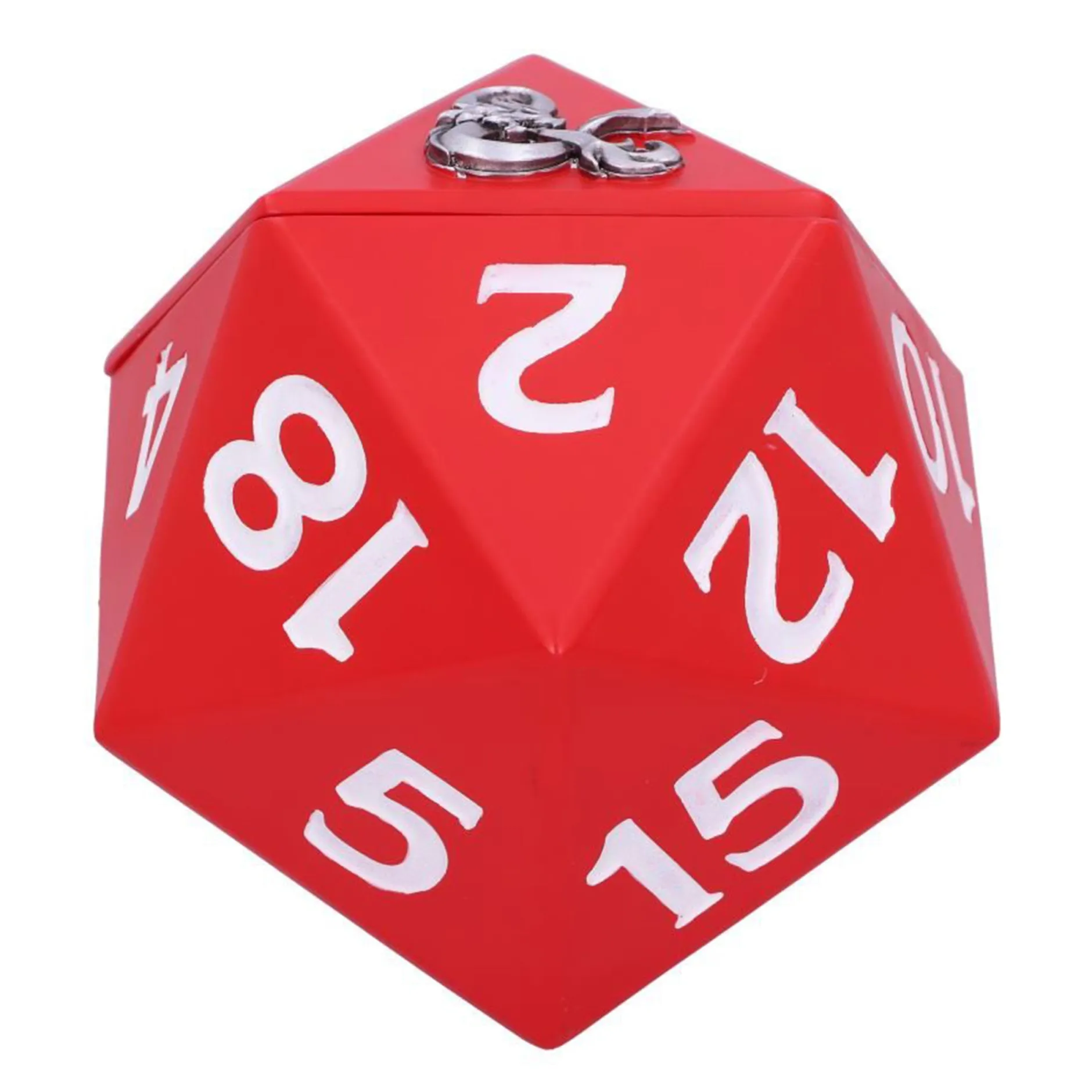Die handbemalte Dungeons & Dragons RPG W20 Würfelbox ist dafür ideal. Die dekorative Box sieht nämlich selbst aus wie ein roter W20-Würfel aus Dungeons & Dragons, zeigt aber statt der 20 das D&D-Logo. Nimmst du den Deckel der Box ab, findest du auch im Inneren ein D&D-Logo, sowie genug Raum, um alle deine verschiedenen Würfel darin zu lagern. Ist die Box verschlossen und gerade nicht in Benutzung, macht sie sich aber auch hübsch als Raumdeko im Regal neben deinen anderen D&D-Items. 😉
