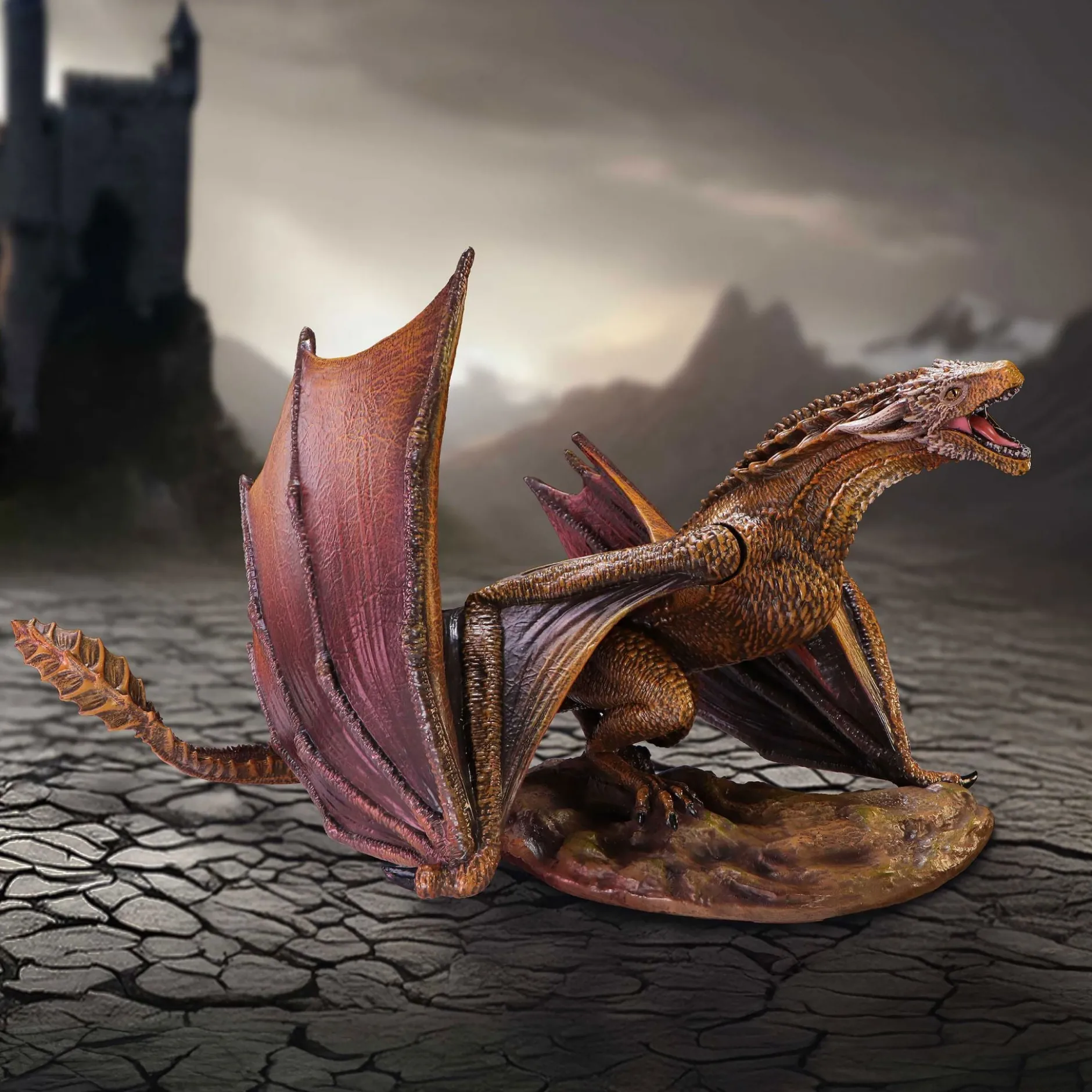 Jede der Figuren ist aus robustem Kunstharz und detailverliebt von Hand bemalt. Drogon, mit seiner dunklen Schuppenhaut und den feuerroten Akzenten, ist in bedrohlicher Haltung dargestellt – Maul geöffnet, Flügel erhoben. Viserion zeigt sich in goldbrauner Farbgebung, brüllend und mit vorgespannter Flughaltung. Rhaegal, tiefgrün und ruhig, hält den Kopf gesenkt, die Flügel zur Stabilisierung weit ausgestreckt. Alle drei Figuren besitzen abnehmbare Flügel, was den Aufbau erleichtert und den sicheren Versand ermöglicht. Verpackt sind sie jeweils in einer dekorativen Game of Thrones-Box – ideal als Geschenk oder für Sammler:innen.