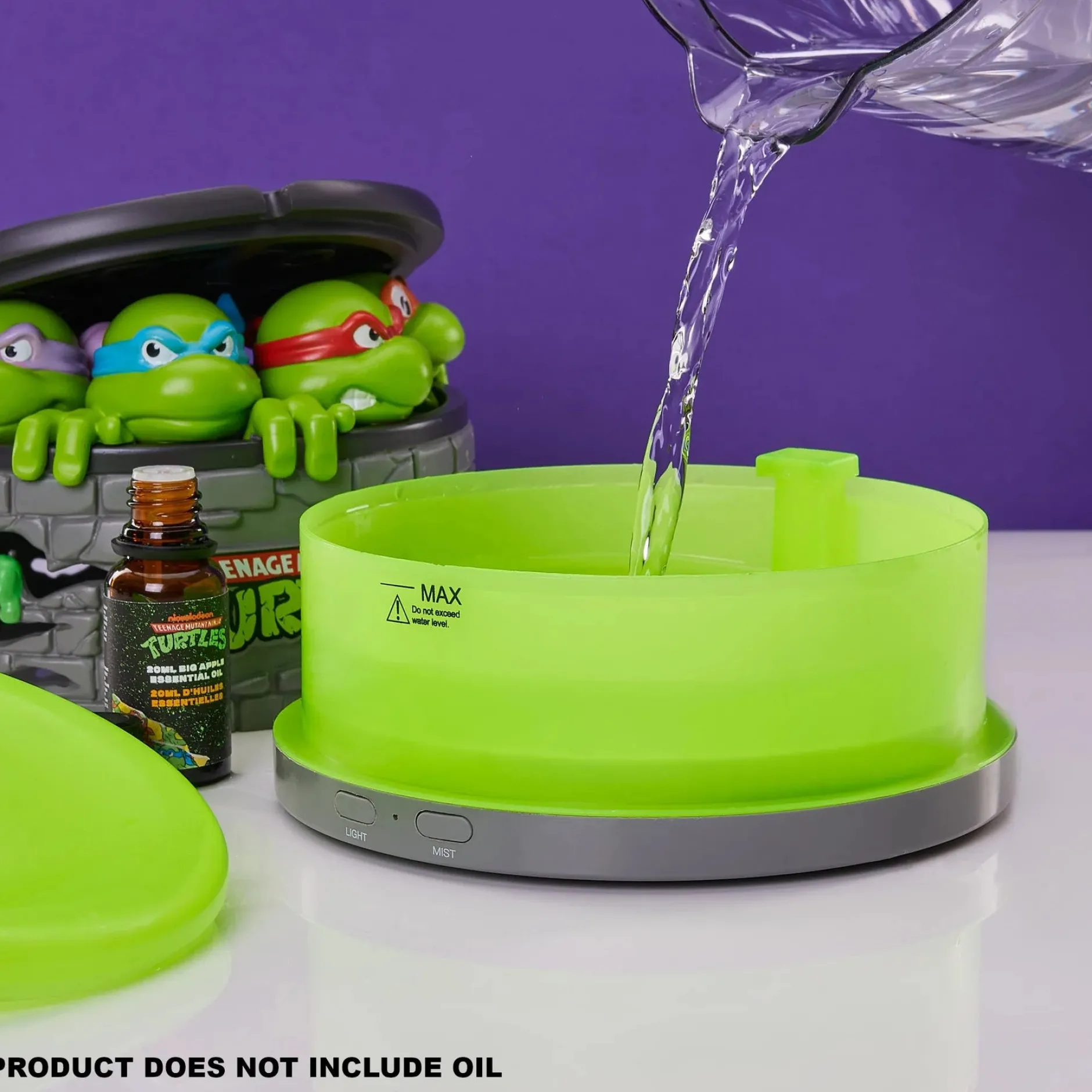 Das offiziell lizenzierte Gerät ist mehr als nur nerdige Deko: Es ist ein vollwertiger Aroma-Diffusor und Luftbefeuchter in einem – betrieben über USB und kinderleicht zu bedienen. Du bekommst sogar eine 20ml Flasche „Big Apple“- Aromaöl direkt mitgeliefert, damit du sofort loslegen kannst. Einfach Wasser einfüllen, ein paar Tropfen Öl dazu, Deckel mit Donatello, Leo, Raph und Mikey aufsetzen und mit einem Knopfdruck startet dein Entspannungsritual – natürlich mit grüner LED-Beleuchtung.