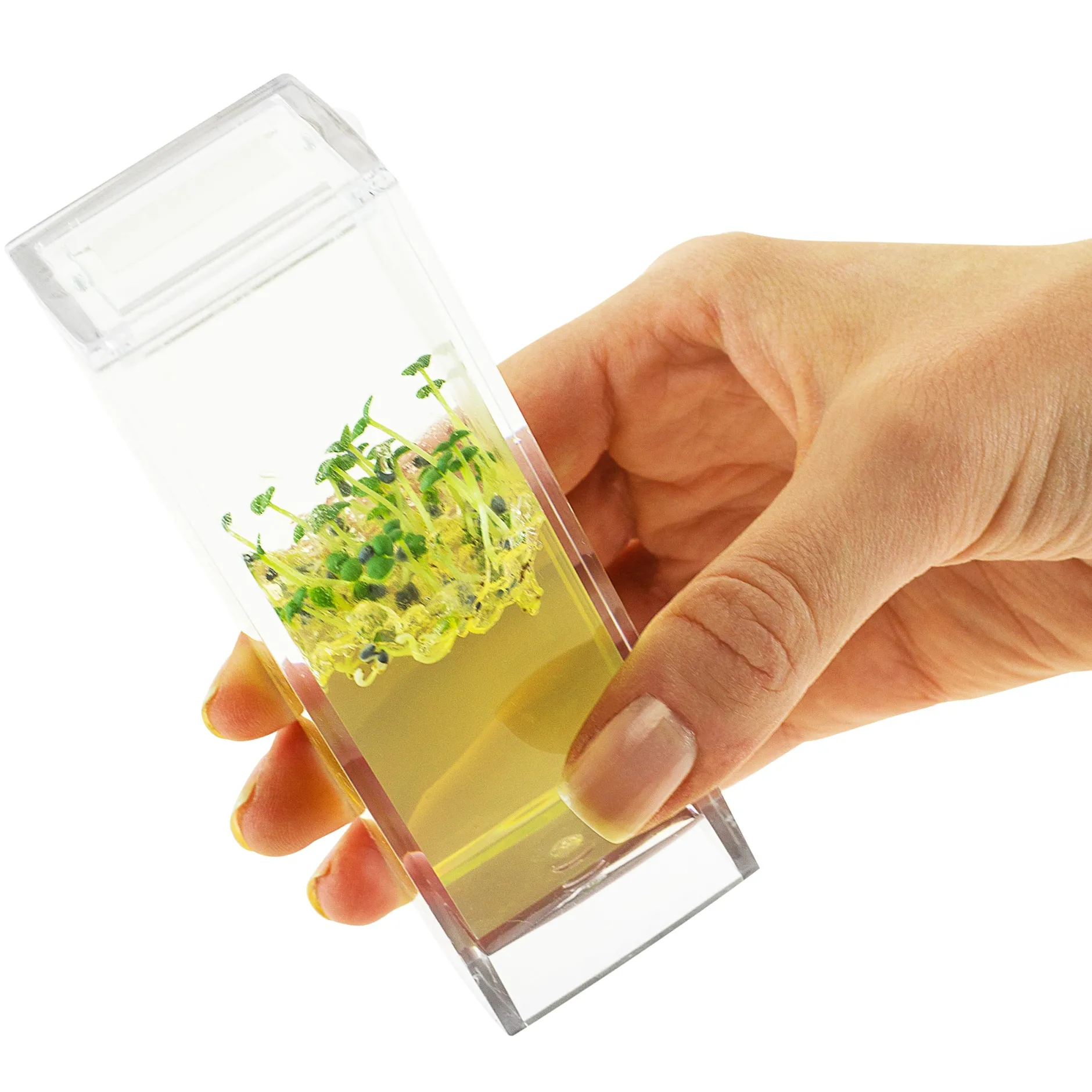 Sind die Samen einmal im Mini-Gewächshaus, werden sie in den nächsten Tagen fleißig wachsen. Dank des Gels sieht man auch die Wurzeln und durch die Farben wirkt das Ganze natürlich besonders futuristisch. Sind die Keimlinge später groß genug, kannst Du sie in die beiliegenden Töpfe umpflanzen. Auch dazu musst Du aber keine Erde holen, sondern einfach nur die ebenfalls enthaltenen Torfkapseln und ein bisschen Wasser einfüllen. Jetzt steht einer ertragreichen Ernte vom eigenen Fensterbrett nichts mehr im Wege. 🙂