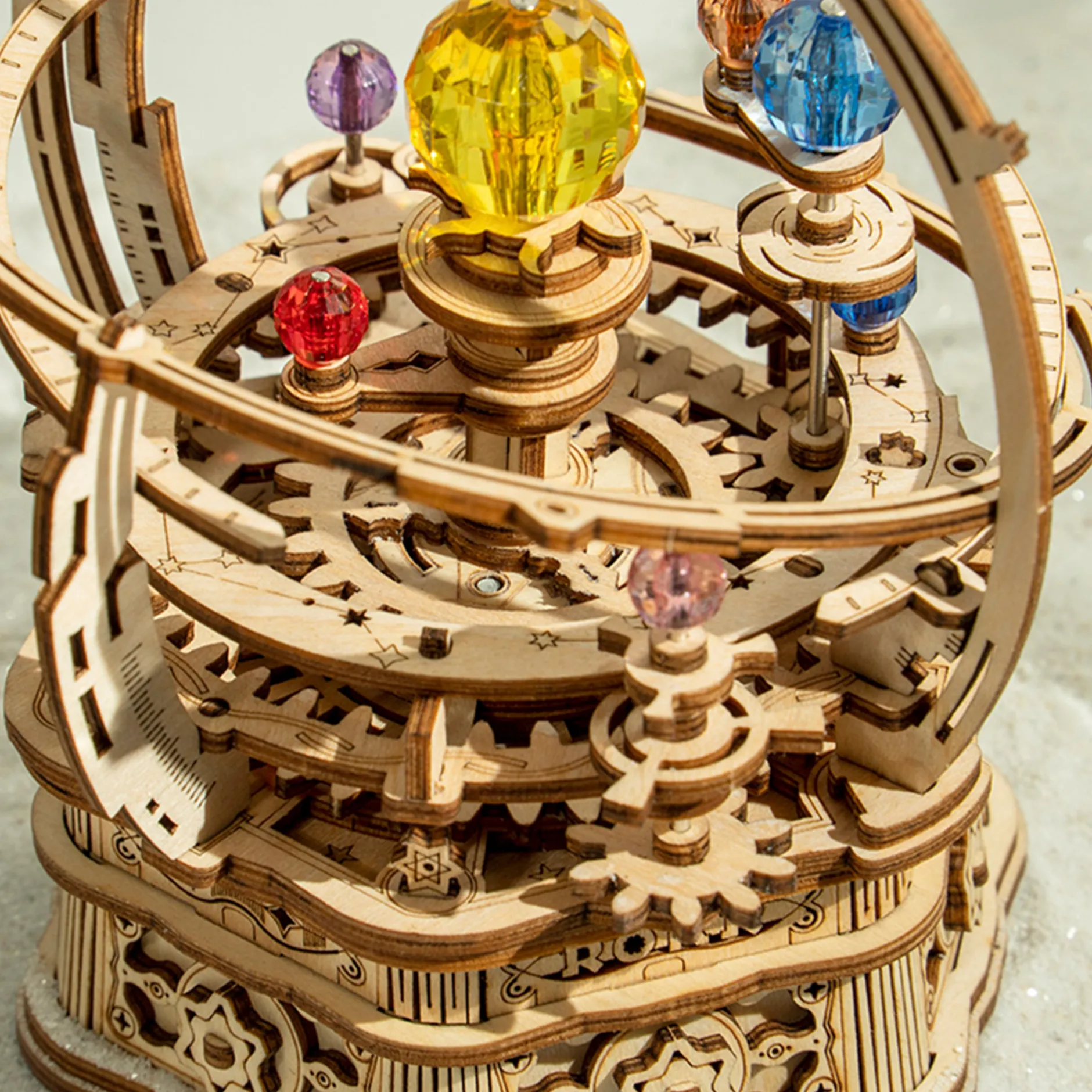 - Dreidimensionales Holzmodell eines Planetensystems, das sich zur Melodie der eingebauten Spieluhr bewegt