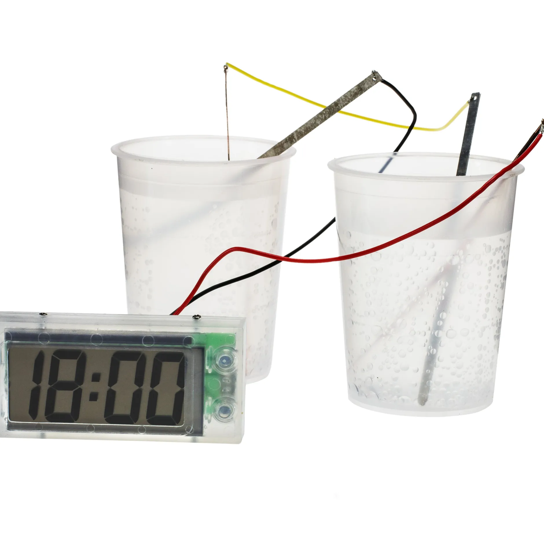 Neben der Digitaluhr selbst, Kabeln, Kupfer- und Zinkstreifen enthält das Set auch zwei Becher, mit deren Hilfe man z.B. aus Salzwasser oder Zitronensaft eine Batterie herstellen kann.